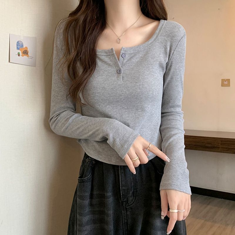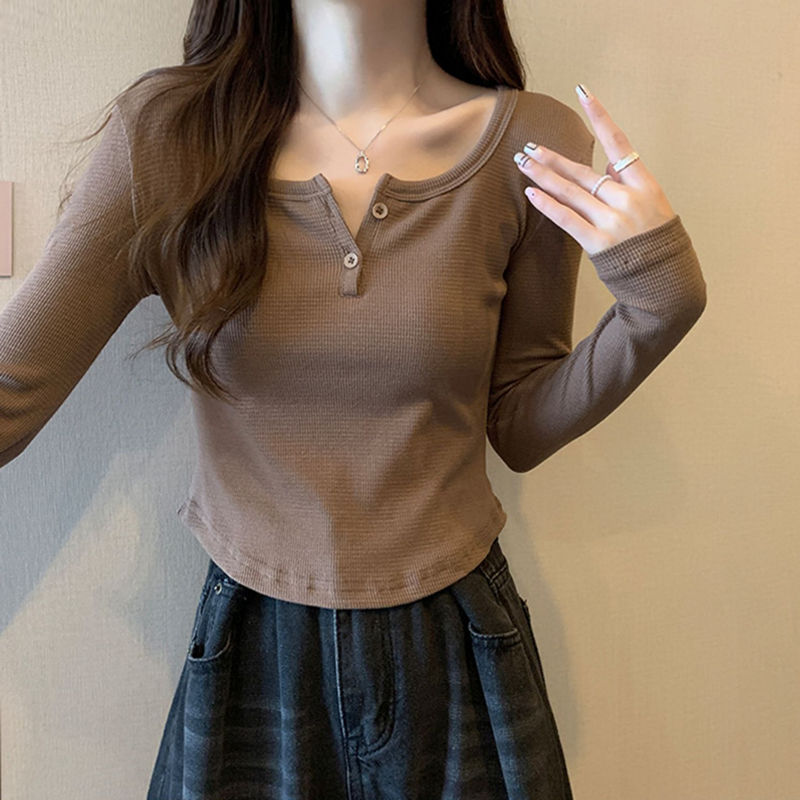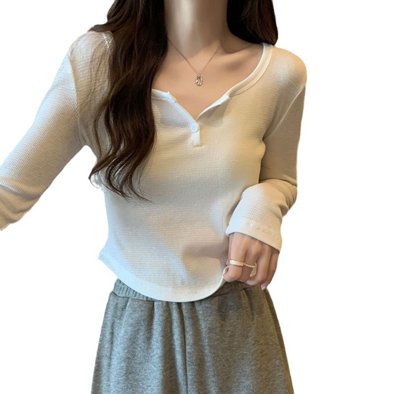 Long-sleeved T-shirt Women’s Spring and Autumn Inner Base Shirt plus size chubby girl Shoulder V-neck Slim-fit Short Short Top