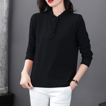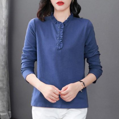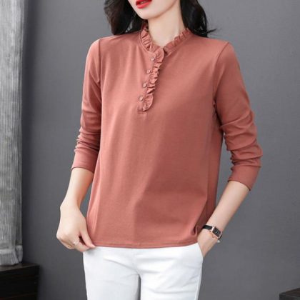 Long-sleeved Top Spring and Autumn T-shirt Women’s Wood Ear Collar Middle-aged Mother Loose plus size Collar New Stylike Base Shirt