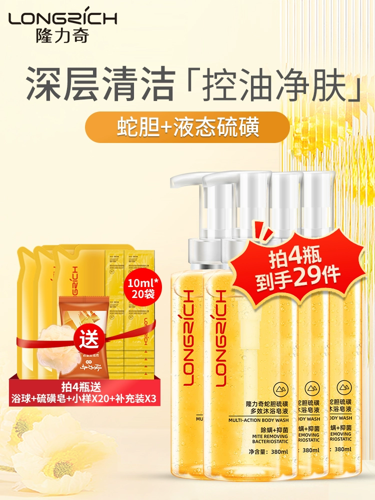 | nameOriginal | Longliqi snake bile sulfur mite-removing shower gel liquid soap removes mites back acne men and women bathing official authentic product |