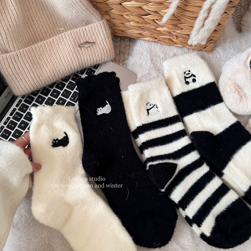 nameOriginal | LookSocks thickened warm Australian velvet cute panda embroidered striped socks solid color simple niche home socks |
