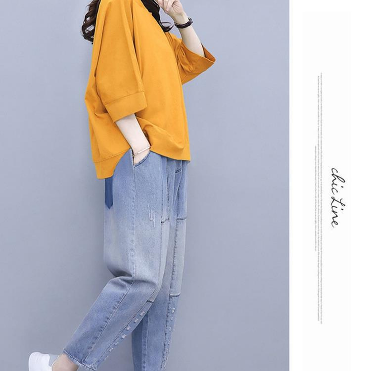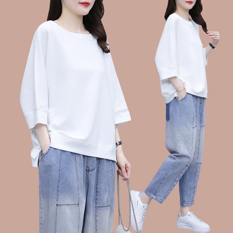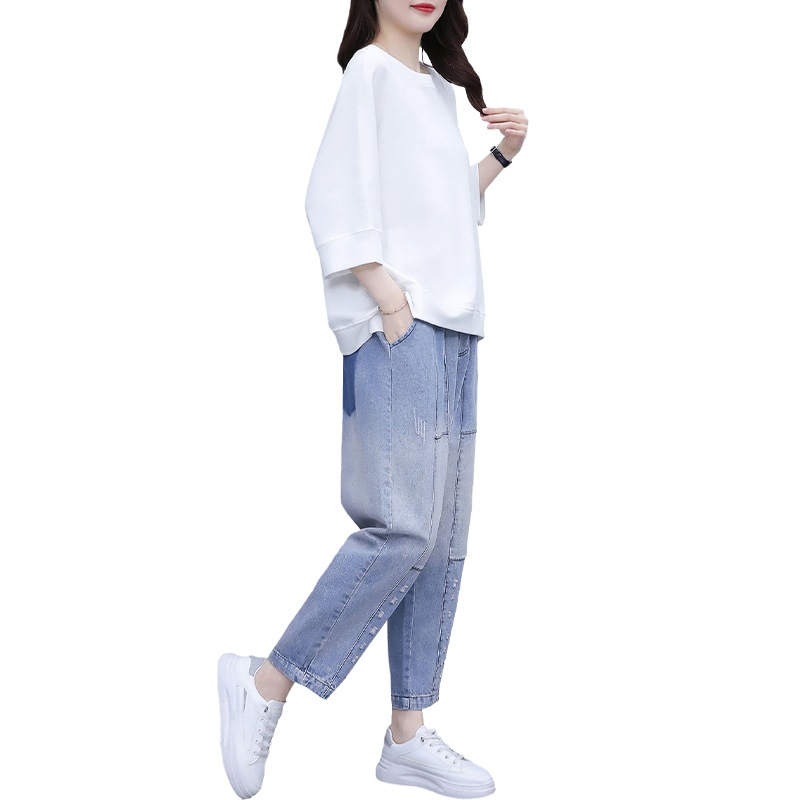 Loose Casual Sports Suit Women’s Early Spring Summer New Base Shirt T-shirt Cropped Jeans Fashion Two-piece Set