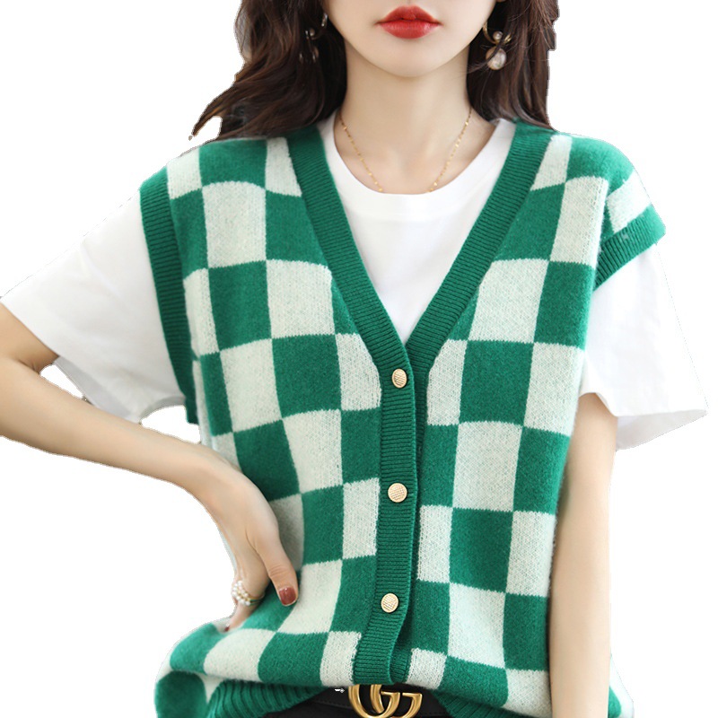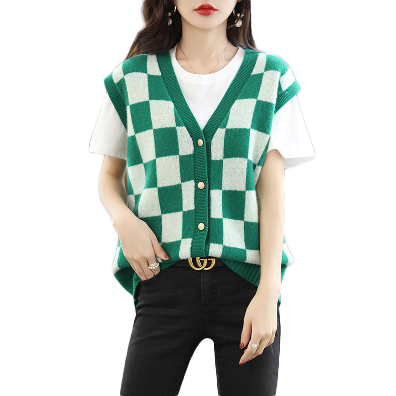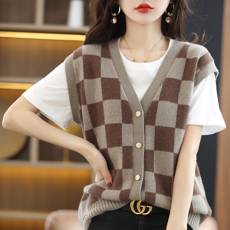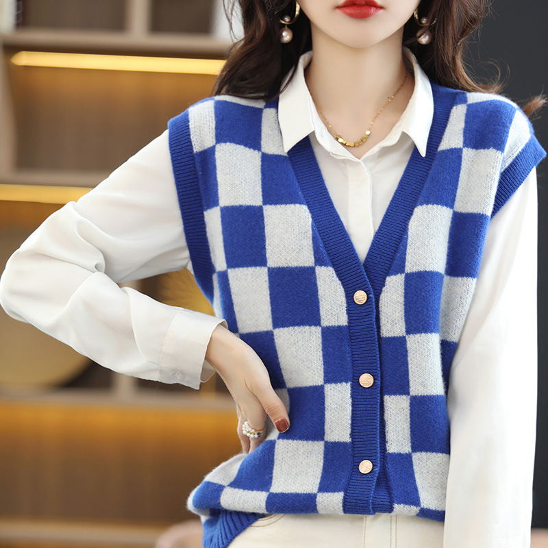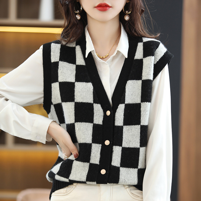 | nameOriginal | Loose color matching collar knitted pure wool cardigan Vest Women's Korean-style Plaid contrast color cashmere vest outer wear waistcoat |