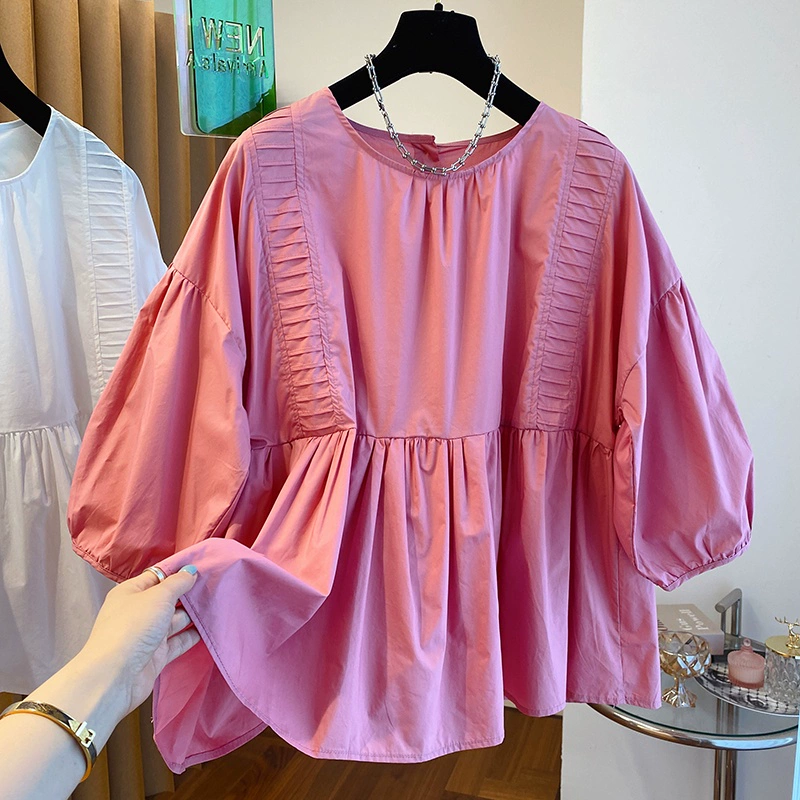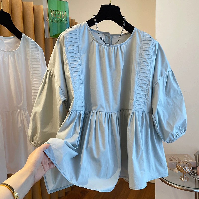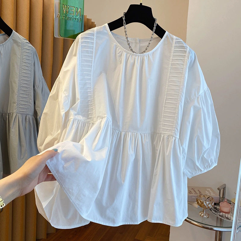 | nameOriginal | Loose hem puffy short-sleeved white shirt that covers the belly |