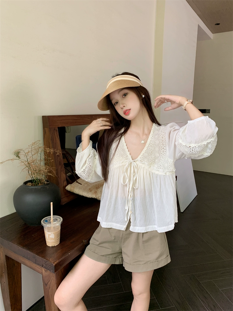 | nameOriginal | Loose pastoral style V-neck hollow lace-up doll top |