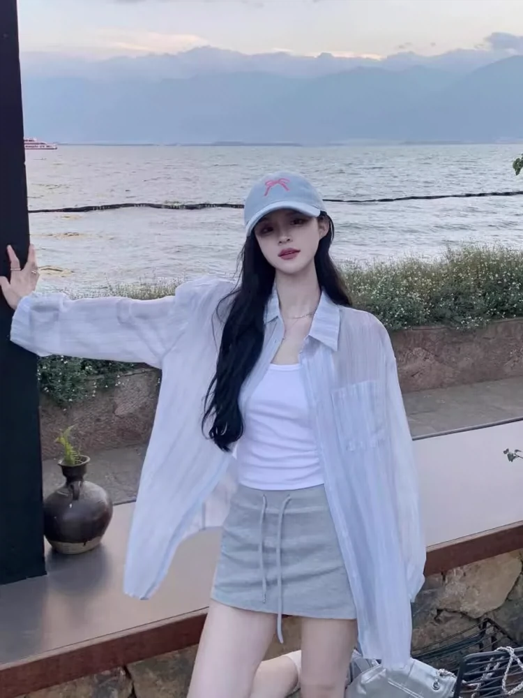 Loose striped long-sleeved blue design sun protection shirt