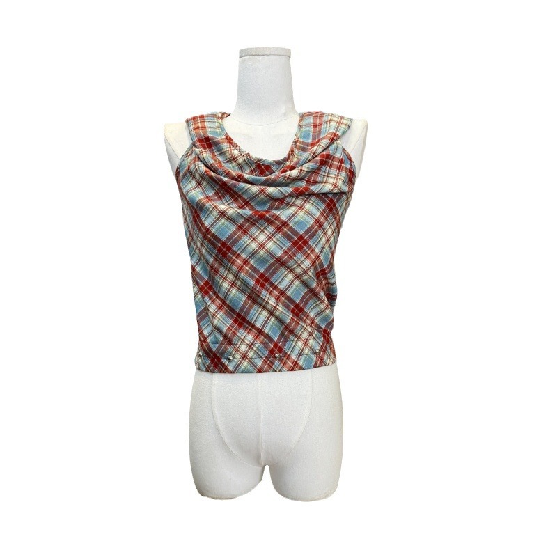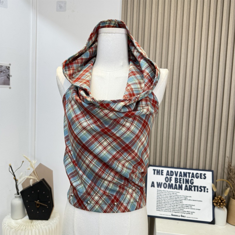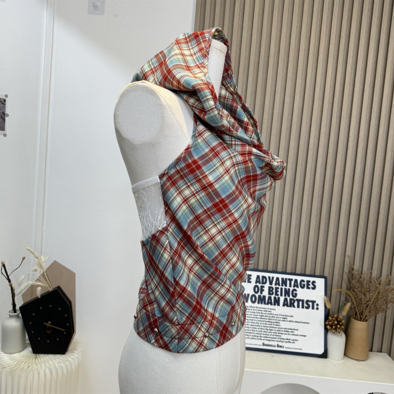 | nameOriginal | Lost in Tokyo Red Plaid Swing Collar Top Women's Summer Spice Sleeveless Hooded Outer Wear Vest |