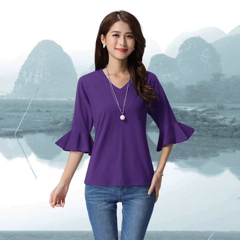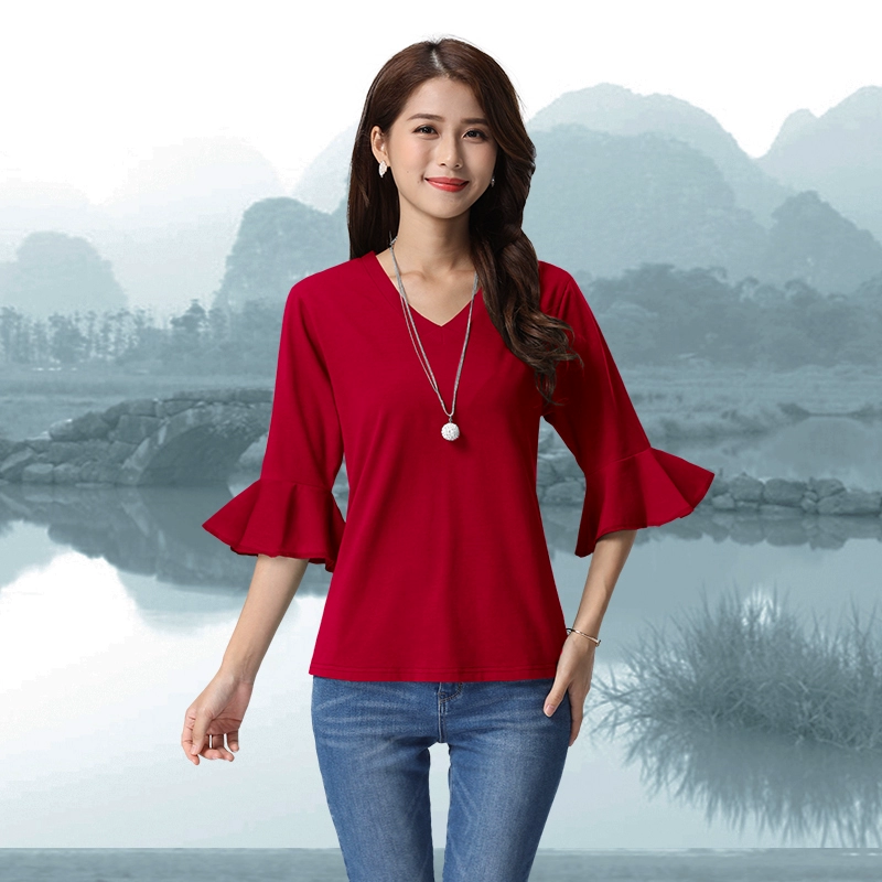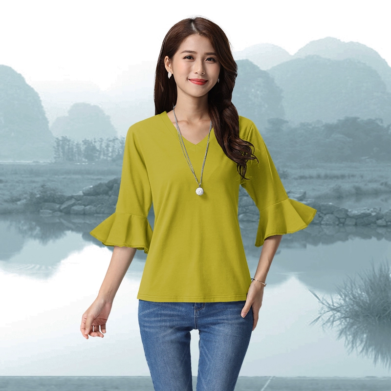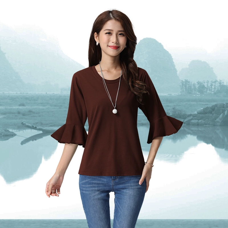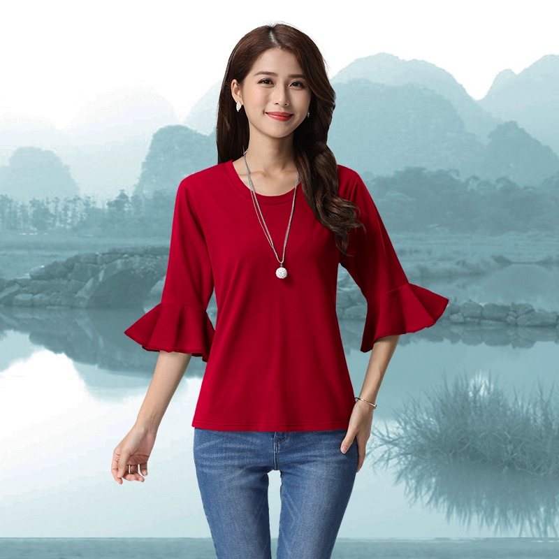 Lotus leaf sleeves and bell mouth pure cotton spring and summer solid color top Korean style loose round neck T-shirt for women all-match slimming bottoming shirt