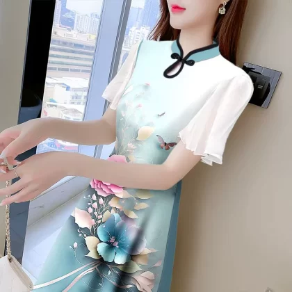 | nameOriginal | Lotus leaf sleeves slits improved cheongsam skirt new style short sleeves new Chinese style niche temperament print fresh and elegant |