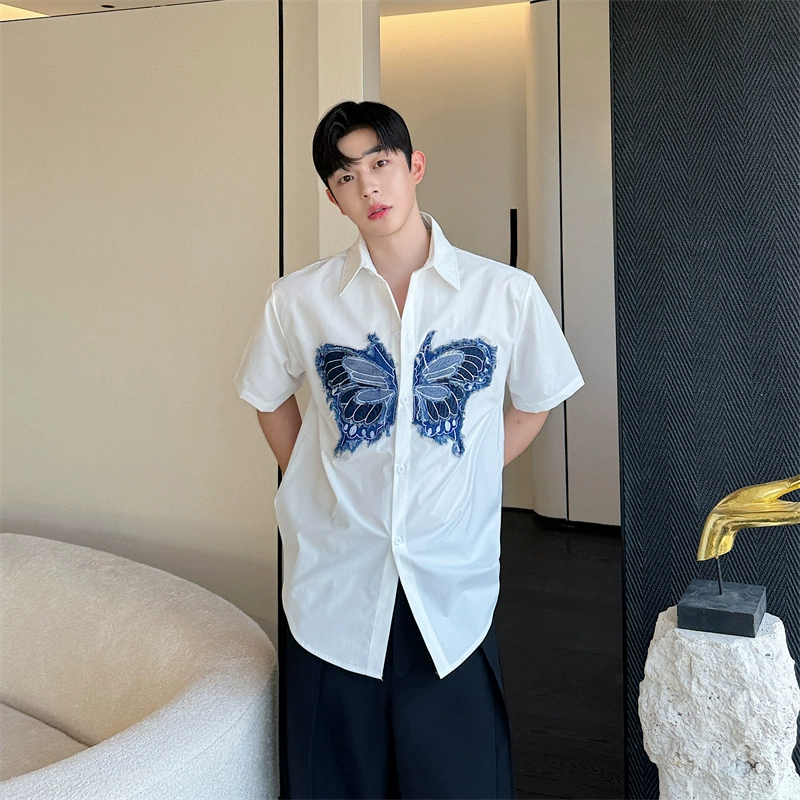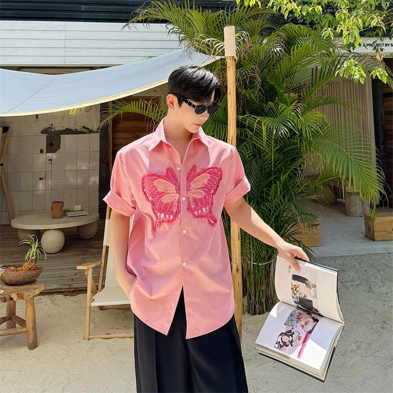 Lotus root pink raw edge butterfly short-sleeved shirt casual patch