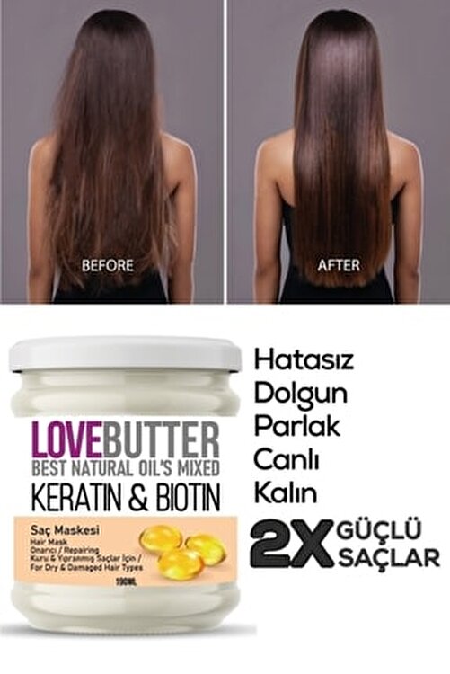 GENERAL FEATURES: Love Butter Keratin Biotin Hair Mask repairs and strengthens dry and worn hair. Provides a shiny appearance without aggravating the hair. Usage: Apply to slightly damp hair by massaging from tips to bottoms. After holding it in your hair for a while, rinsing can be done. Wrap your hair with a towel so that the mask works better on your hair and gives a better result. WARNINGS: For external use only. Avoid contact with eyes. In case of contact, rinse with plenty of water. STORAGE CONDITIONS: Keep out of reach of children. Keep at room temperature. Do not expose it to direct sunlight. INGREDIENTS/INGREDIENTS (INCI): Aqua, Cetearyl Alcohol, Behentrimonium Chloride, Dioleoylethyl Hydroxyethylmonium Methosulfate, Sunflower Seed Oil Glycerides, Glyceryl Stearate, Ceteareth-20, Ceteareth-12, Cetyl Palmitate, Polyquarternium-37, Sodium Benzoate, Glycyl Glycerin, Glyceryl Caprylate/Caprate, Propylene Glycol, Bioflavonoids, Hydrolyzed Vegetable Protein, Hydrolyzed Adansonia Digitata Extract, Dextrin, Biotin, Panax Ginseng Root Extract, Arginine, Acetyl Tyrosine, Arctium Lappa Leaf Extract, Niacinamide, Ornithine Hcl, Zinc Gluconate, Citrulline, Glucosamine HCL, Citric Acid, Camellia Oleifera Seed Oil, Potassium Sorbate, Parfum Benzyl Salicylate, Linalool.