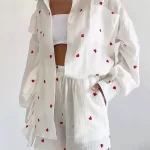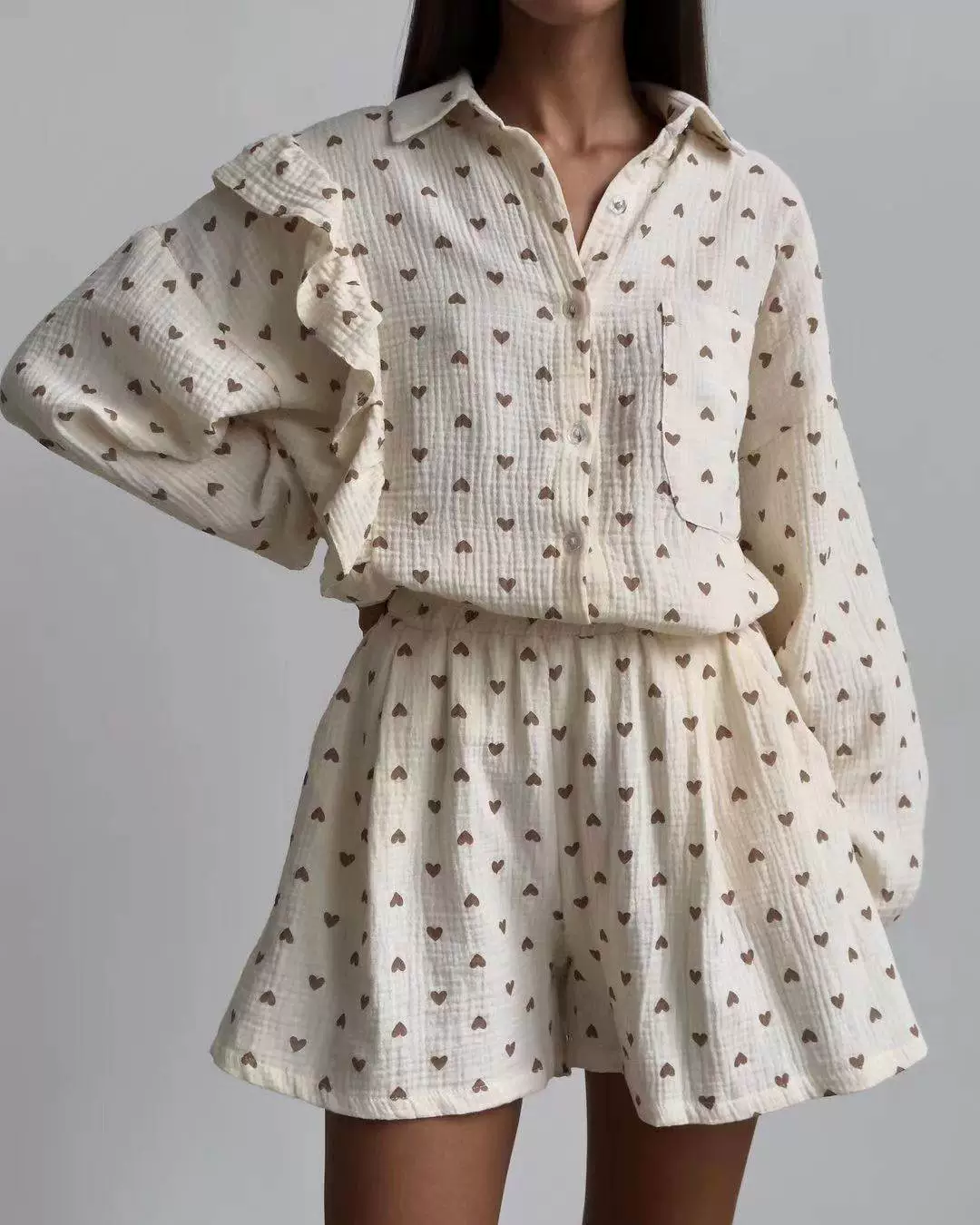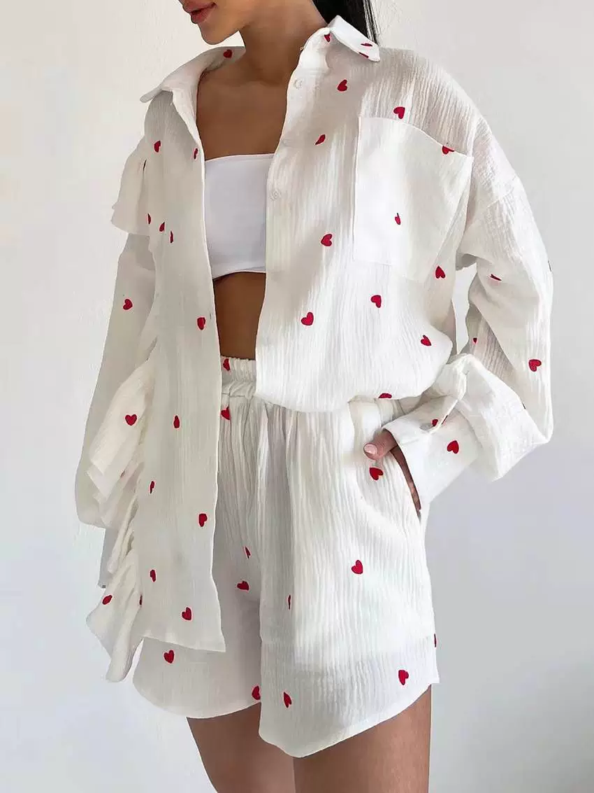 | nameOriginal | Love shirt and shorts set European and American heart-shaped print stitching ear-edge shirt and shorts set |