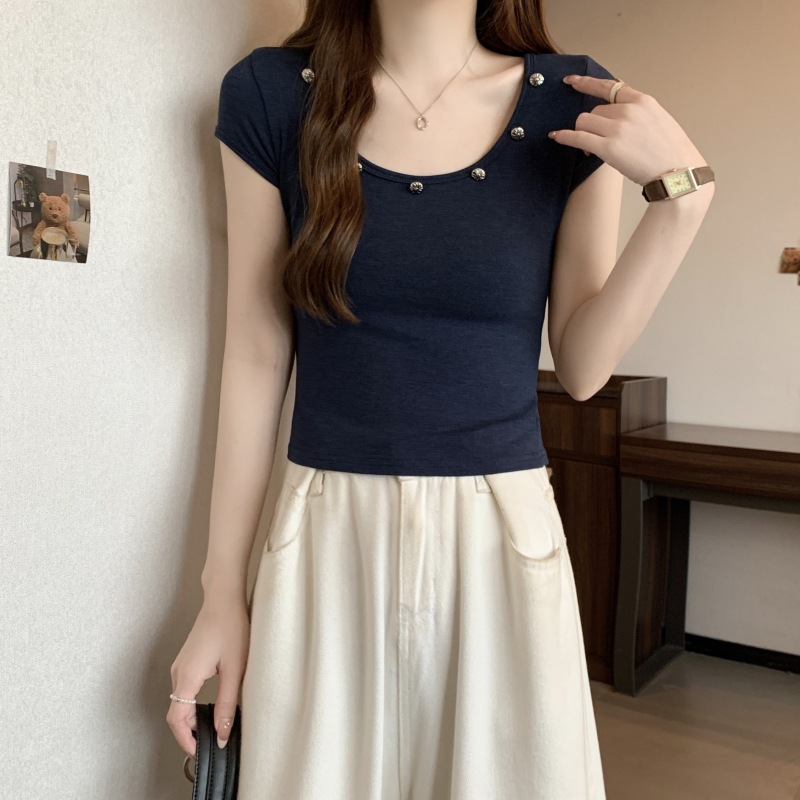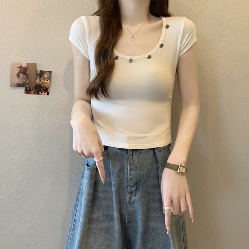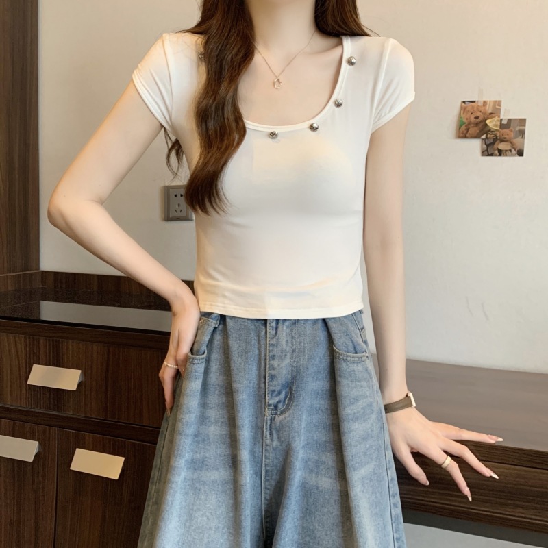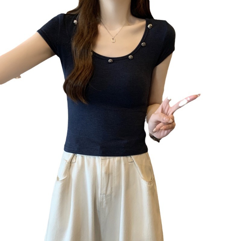 Low Collar Shoulder Button Short-sleeved T-shirt Women’s Niche Design Summer Small Hot Girl Slim-fit Short Top