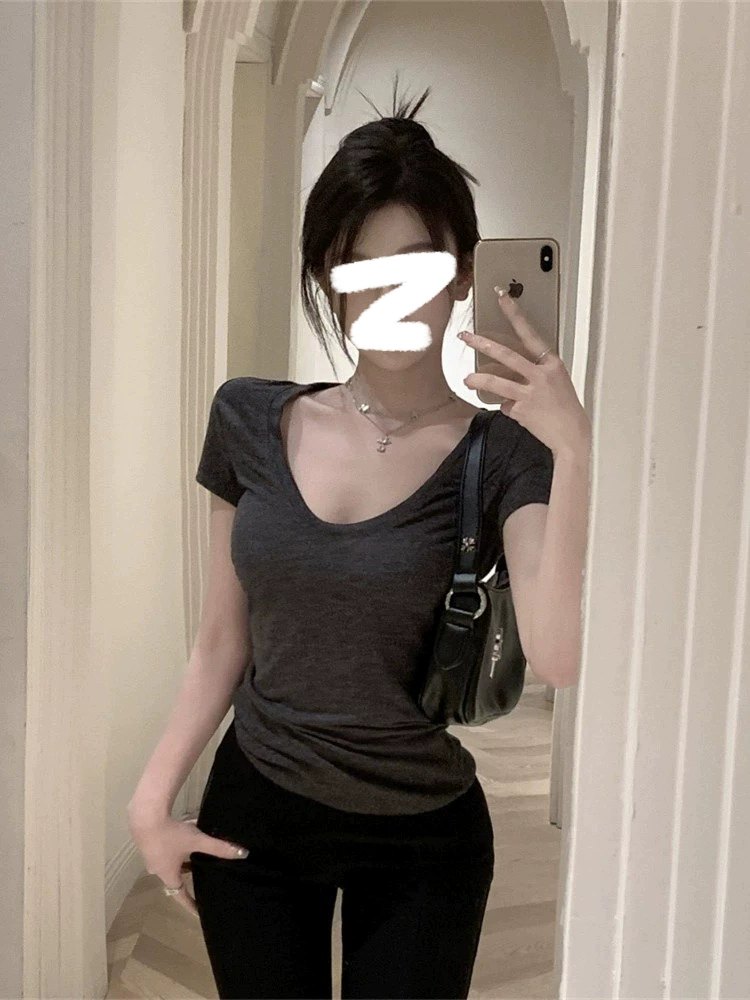 Low chest 2024 new short -sleeved casual U -collar T -shirt top