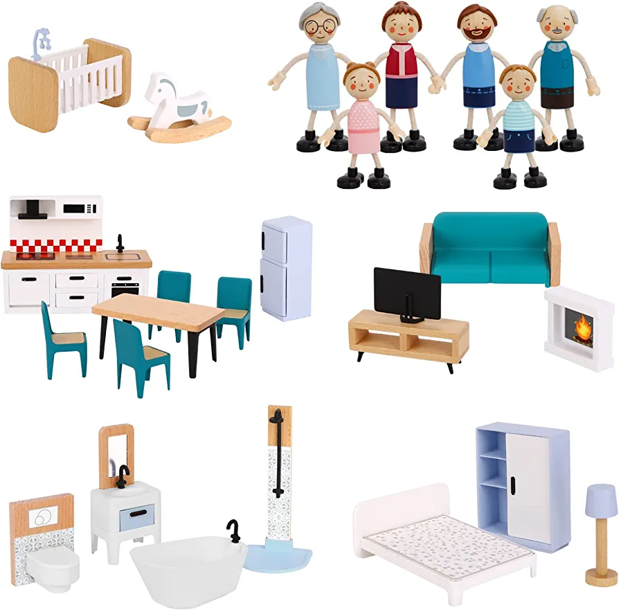 MODERN WOODEN DOLLHOUSE – This dollhouse is the perfect addition to any child’s toy collection. It includes a kitchen, bathroom, living room, balcony, and bedroom, each equipped with a set of furniture. The six family dolls, standing at 3-4 inches high, add to the fun of playing with this lovely toy. Let your child’s imagination run wild as they decorate their very own toy house!