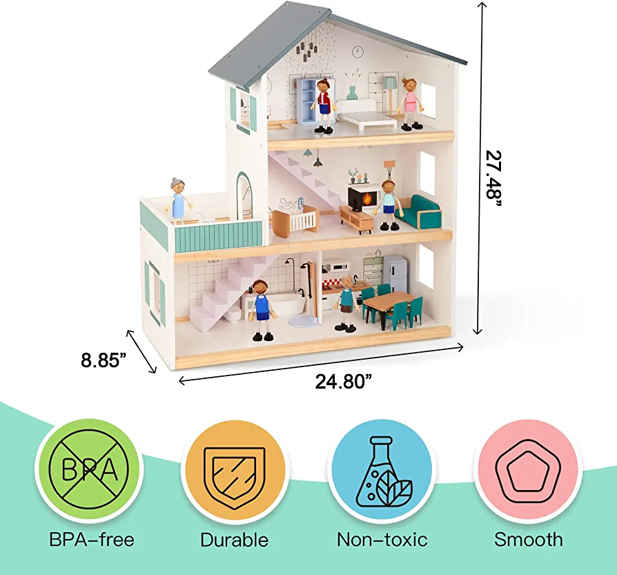 HIGH QUALITY AND SAFE – Made mainly of wood, this dollhouse is solid and lovely with smooth and round edges. It’s BPA-free and complies with US toy safety standards to ensure the safety of children’s play.