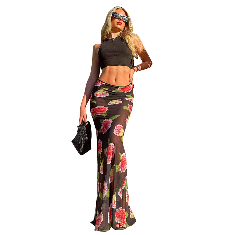 M24SK028 European and American women's 2024 summer women's flower printing mesh fishtail temperament long skirt wholesale