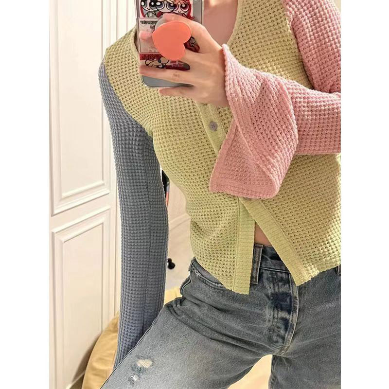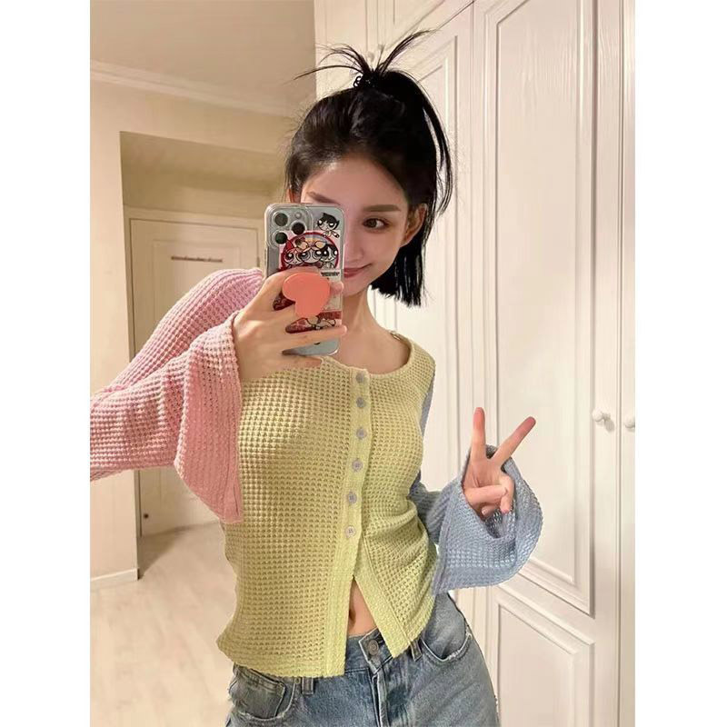 Macaron Color Contrast Sweater Women’s 2024 New Summer Design Niche Sweet Unique Chic Long Sleeve Top