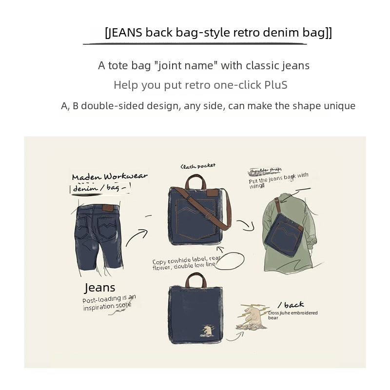 | nameOriginal | Madden workwear American retro Denim shoulder Messenger Bag Denim Embroidered large capacity portable tablet tote bag |
