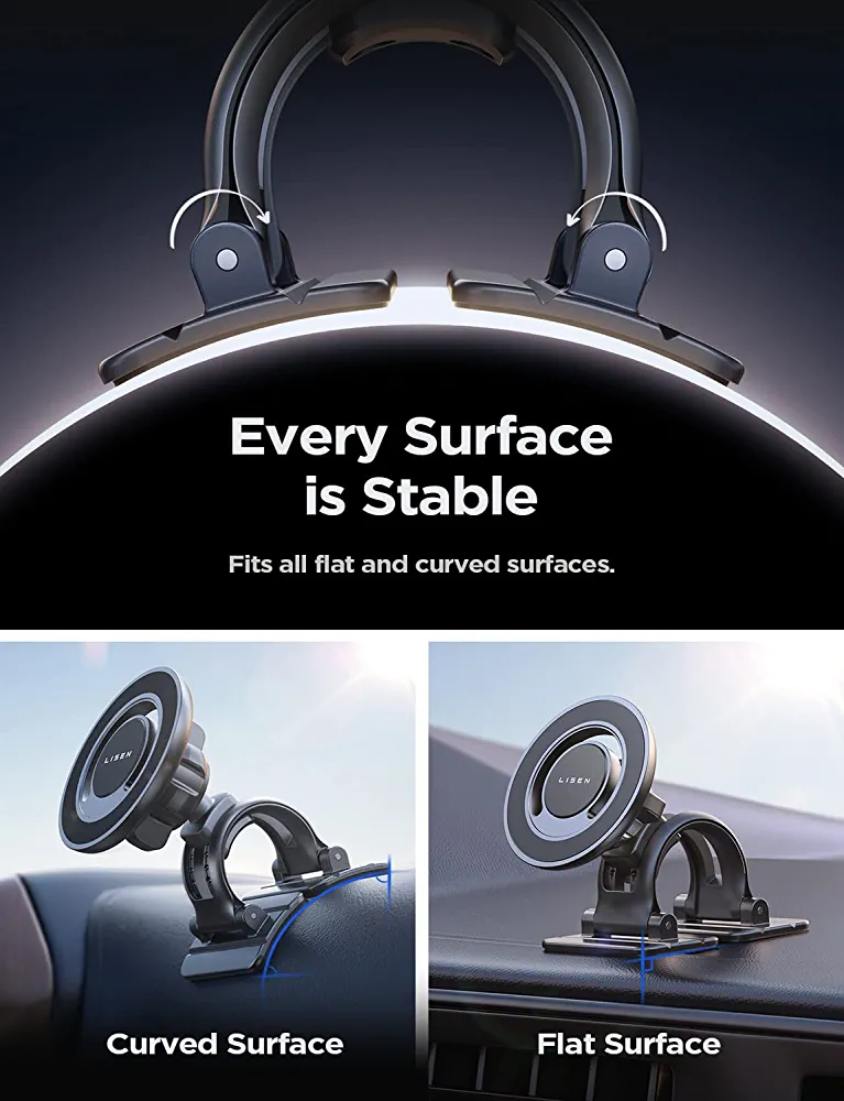 Our exclusive technology features a strong permanent magnetic 1:1 fit for MagSafe, which is the latest research and development of LISEN laboratory in 2023 exclusive patent. This holder has a stronger magnetic suction and does not affect the phone signal or damage the phone battery, unlike other cheap single-lap magnetic car phone holders for iPhone 12 13 14 Magsafe mount.