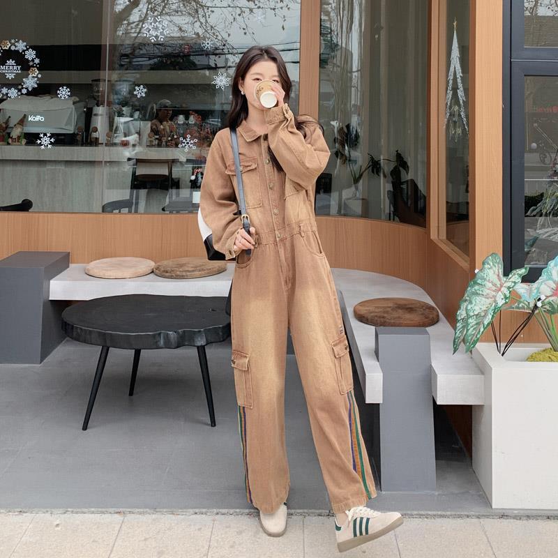 Maillard Brown Denim overalls women’s 2024 spring new retro loose slimming straight wide-leg pants