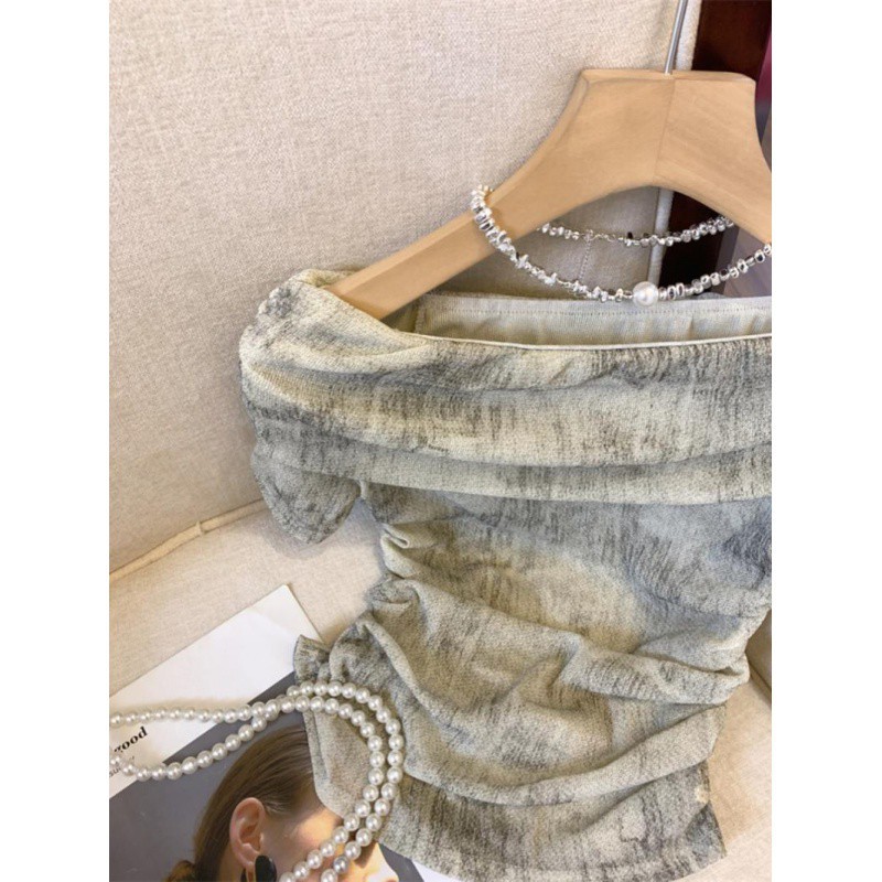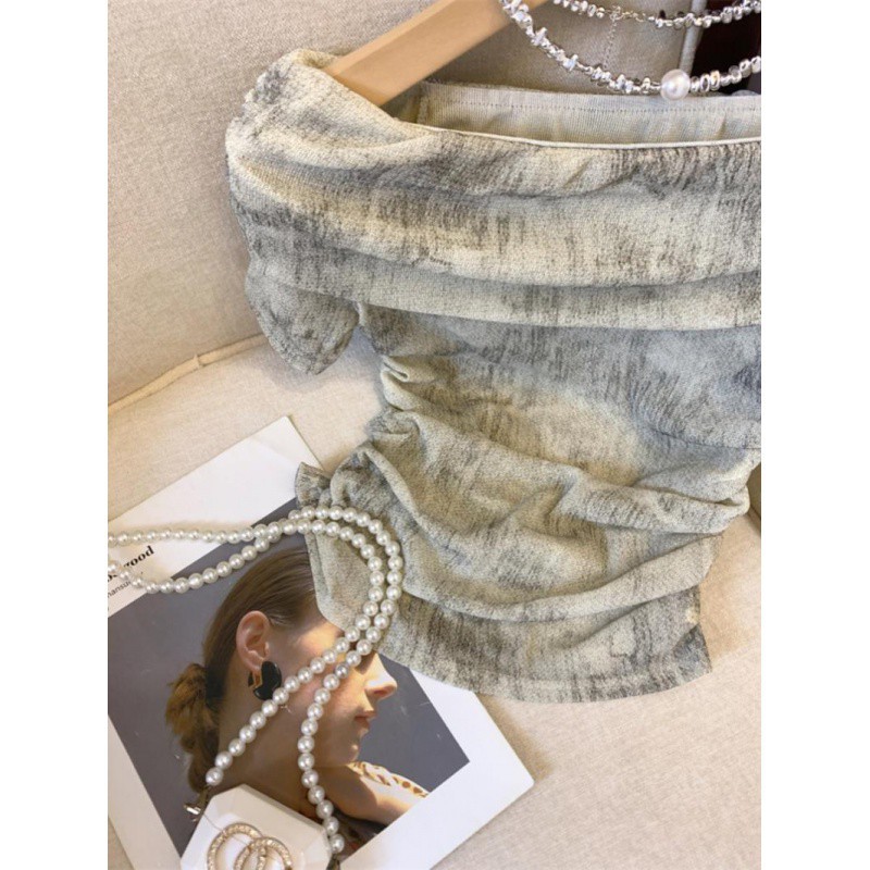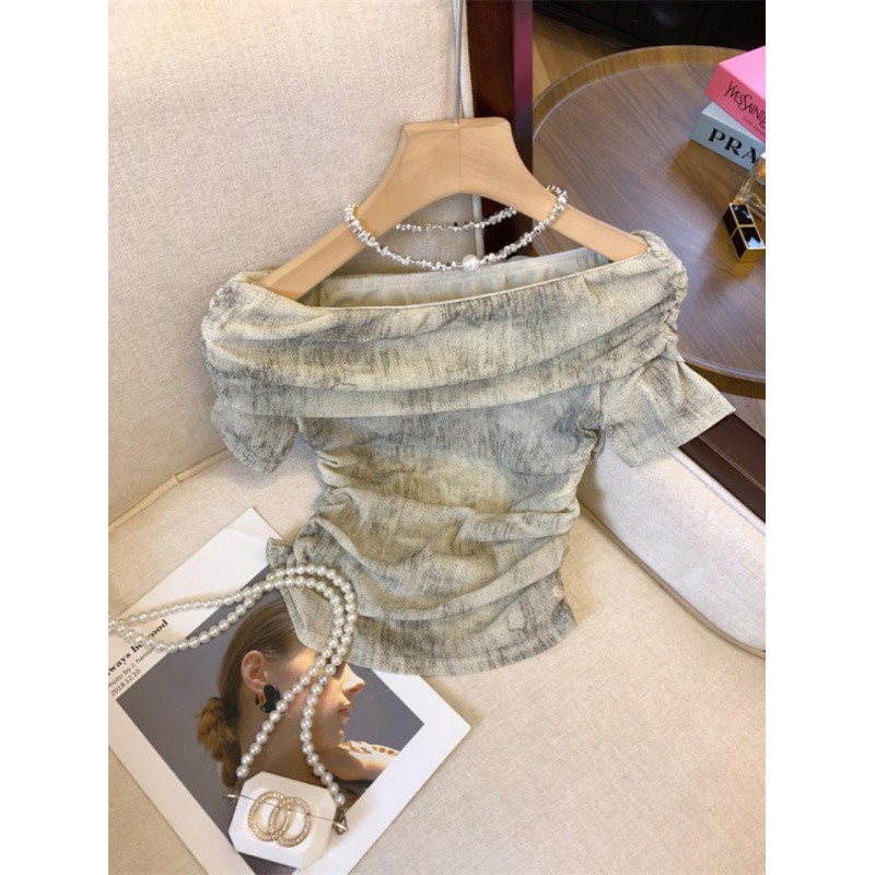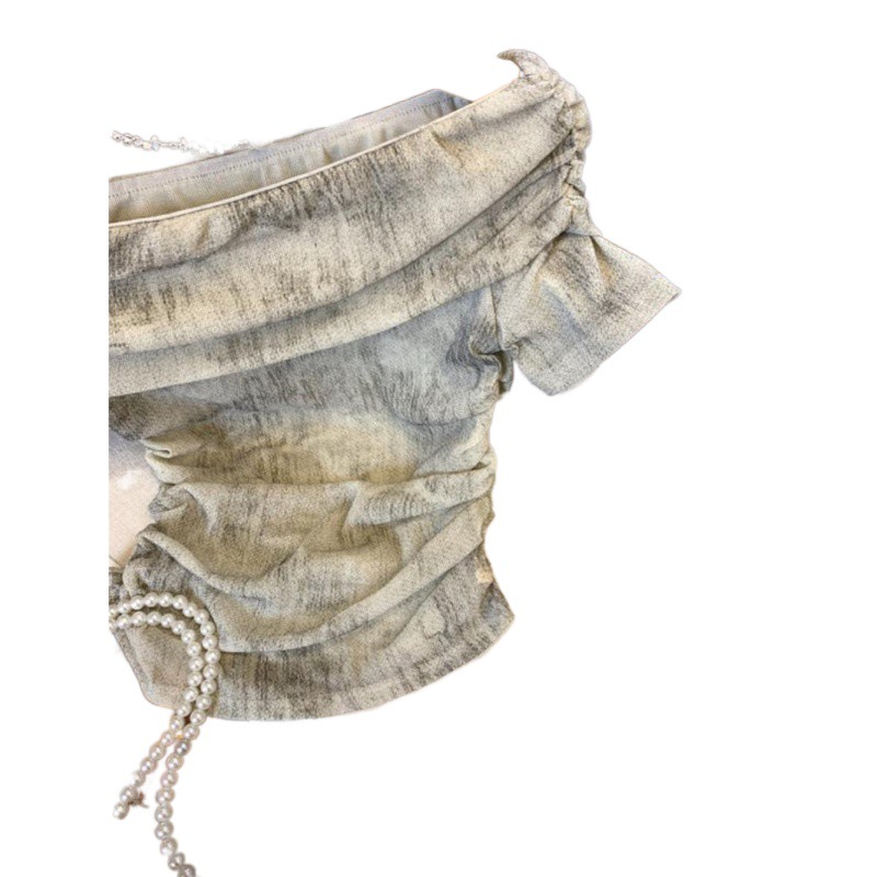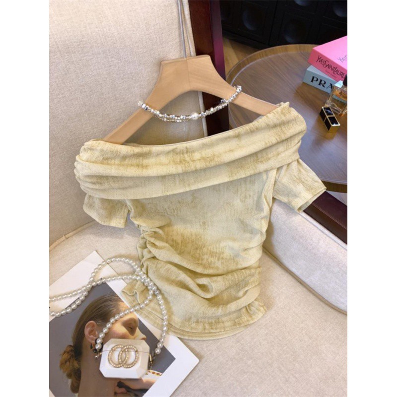 | nameOriginal | Maillard Dye Off-shoulder Short-sleeved T-shirt Women's Summer 2024 Pleated Waist Design Niche Chic Small Top |