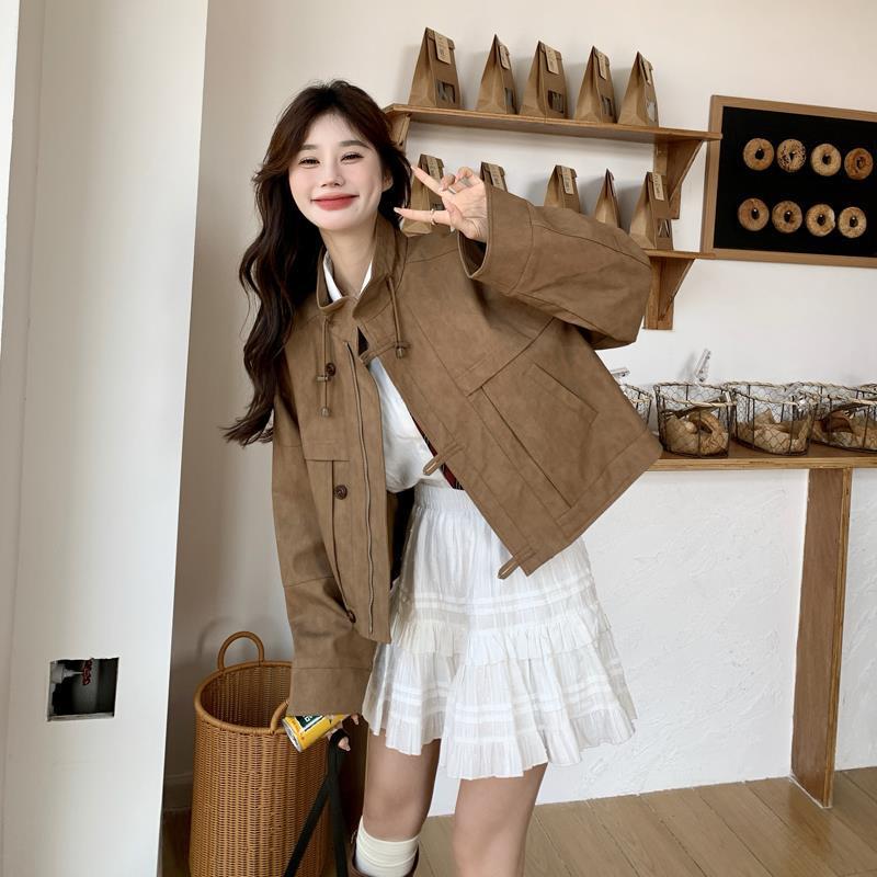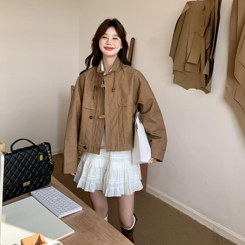 Maillard Retro Brown Short Leather Jacket Women’s Spring and Autumn 2024 New Design Super Nice Vertical Collar Jacket