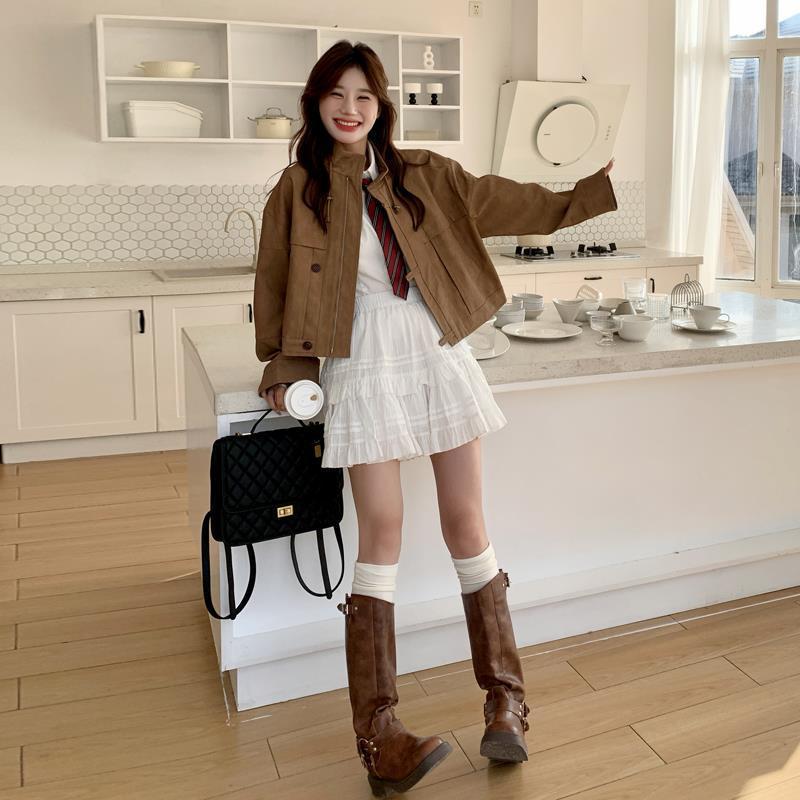 Maillard Retro Brown Short Leather Jacket Women's Spring and Autumn 2024 New Design Super Nice Vertical Collar Jacket