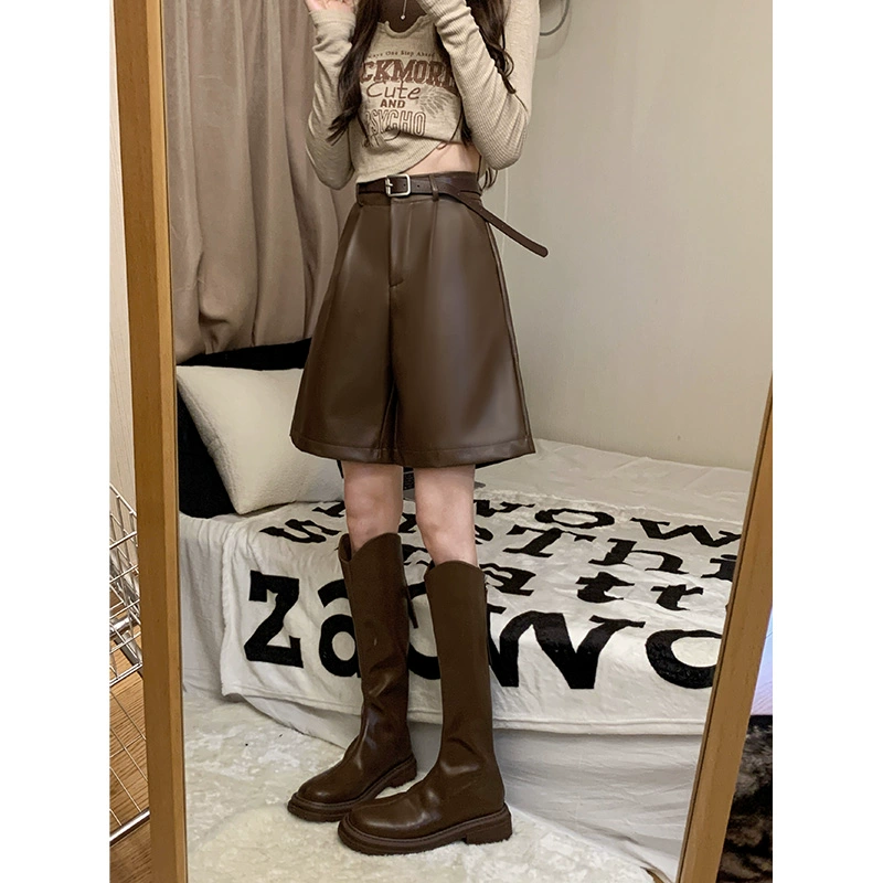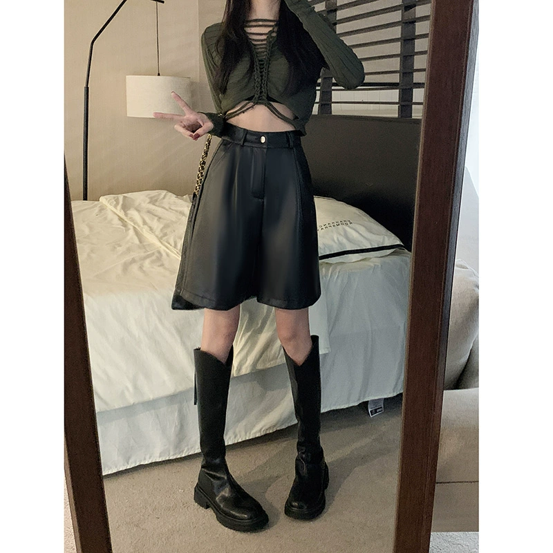 | nameOriginal | Maillard style high-end pu leather high-waist casual shorts for women spring design loose wide-leg five-point pants trendy |