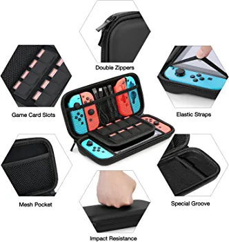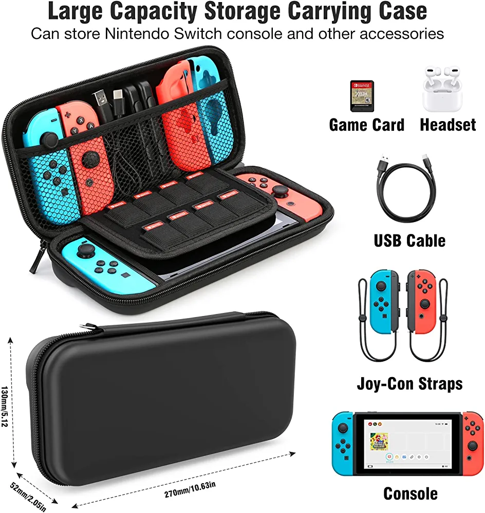 The carrying case has ample storage space for your Nintendo Switch, game cards, Joy-Cons, Joy-Con Straps, cables, headphones, AC adapters, and other accessories.