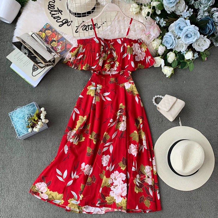 Maldives beach dress women's new Bali beach vacation long dress one-line collar off-shoulder suspender dress