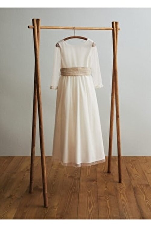 Dress .– marina. Celebration collection, Tulle fabric, Swedish tulle cuffs, Flared pattern, Long model, Round neck, Truvakar sleeves, Sleeves with plumeti fabric, Decorative belt, Bow waist, Lining, Button back. 100% polyester, Lining: 65% polyester ,35% cotton, Belt: 55% linen ,45% cotton. Back length 82.0 cm