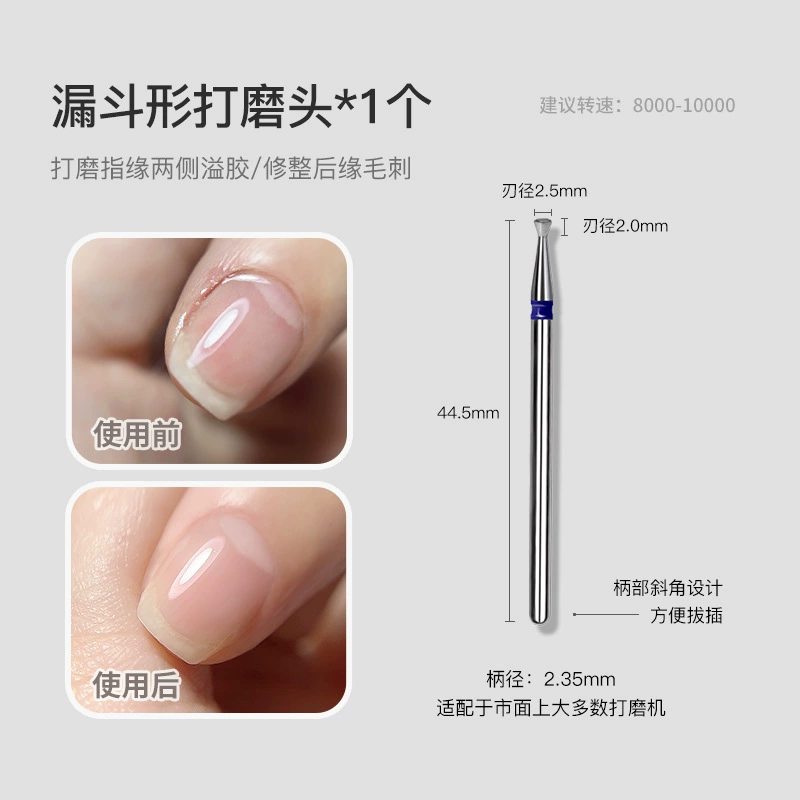 | nameOriginal | Manicure flying saucer mini funnel-shaped polishing head to remove excess glue on both sides, trim barbs and dead skin, and shape the side edges |