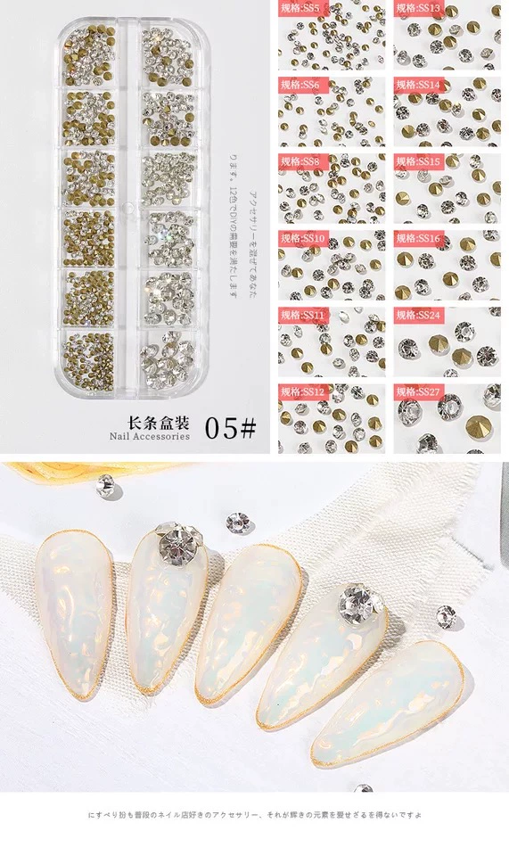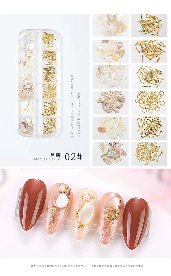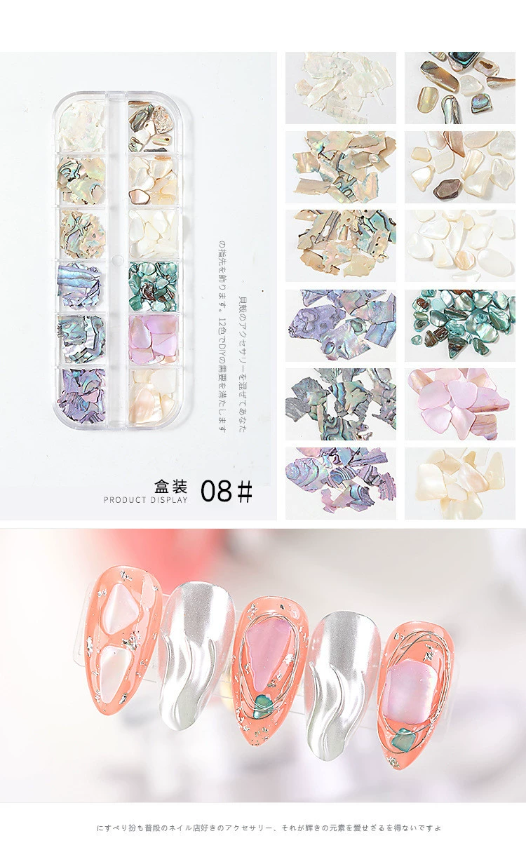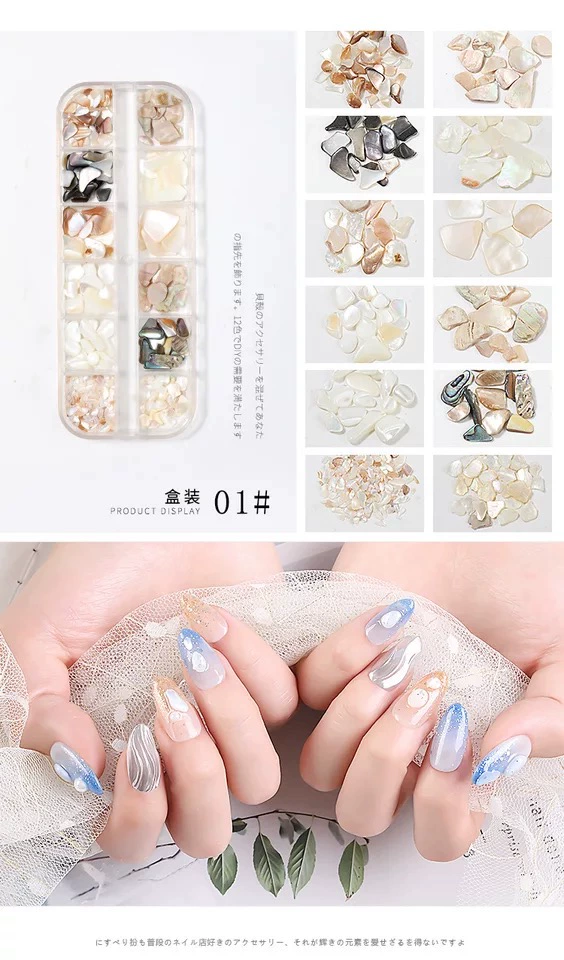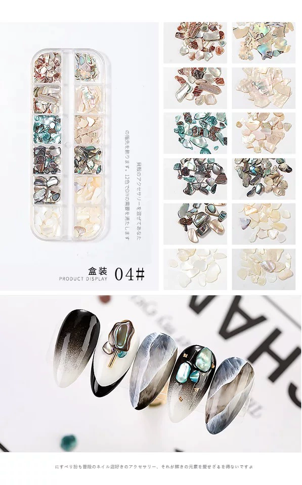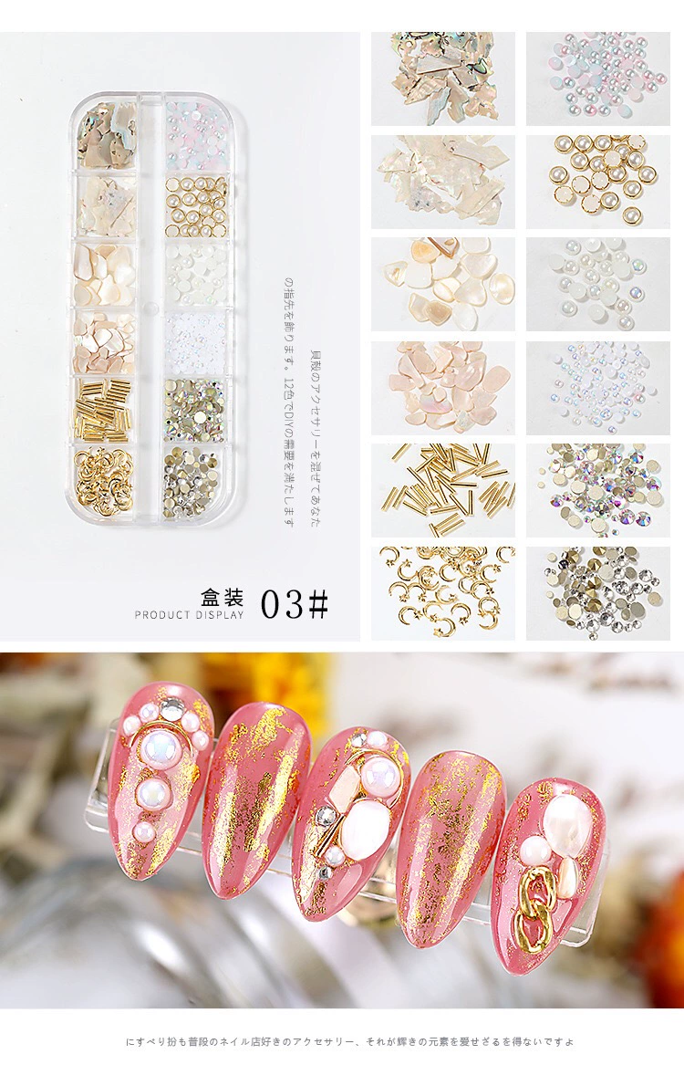 | nameOriginal | Manicure Internet celebrity same style Japanese shell stone abalone slices flat bottom pointed bottom pearl rhinestone rivets 12 grids mixed decorations |