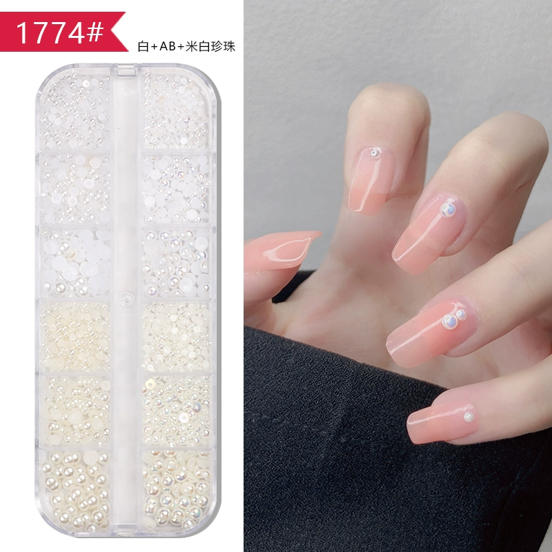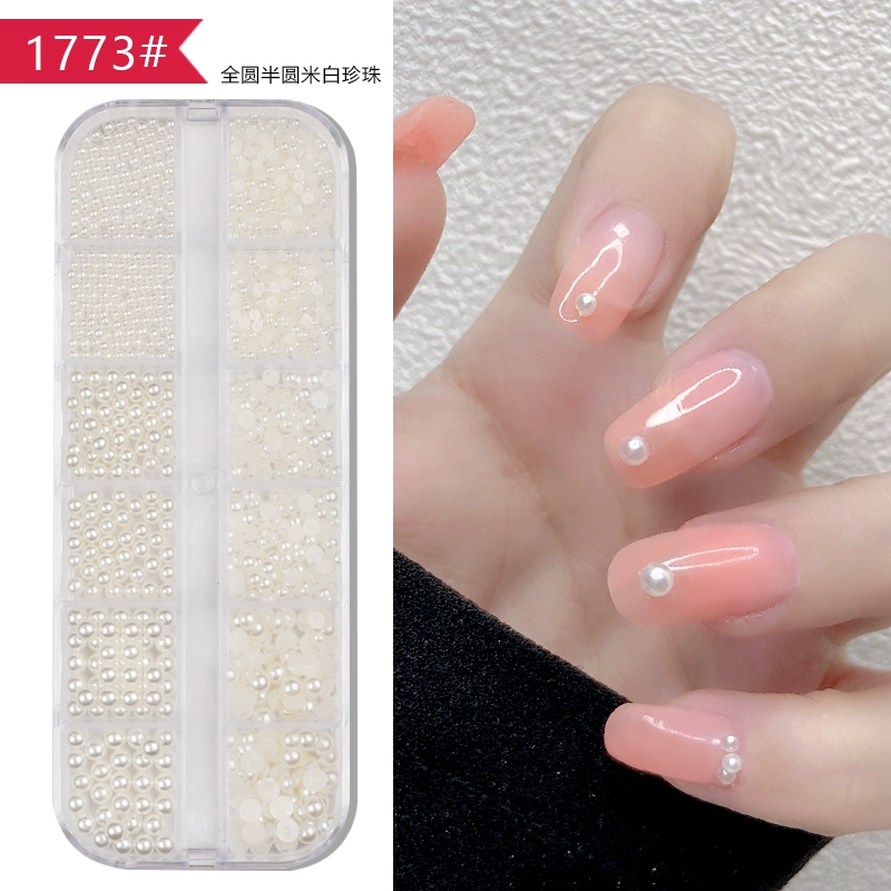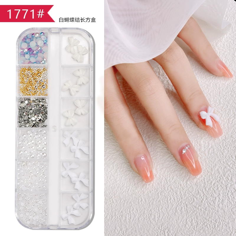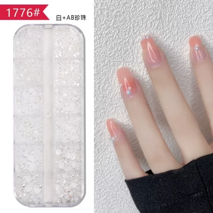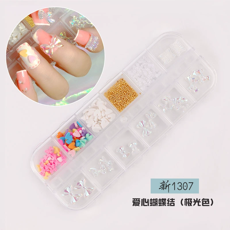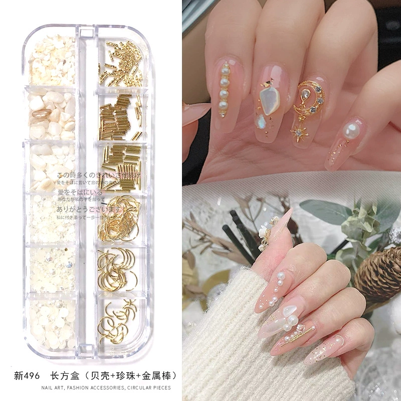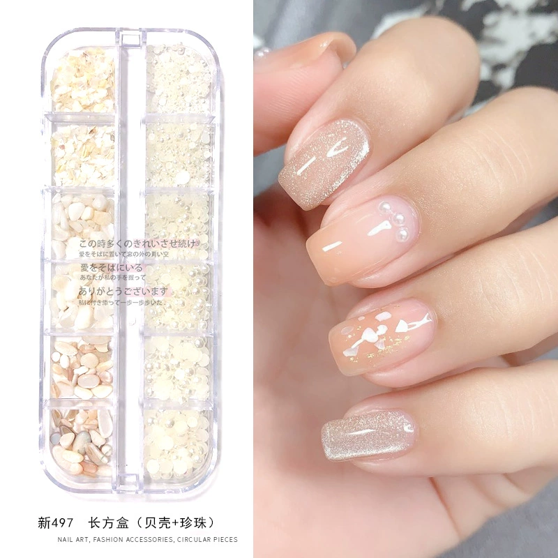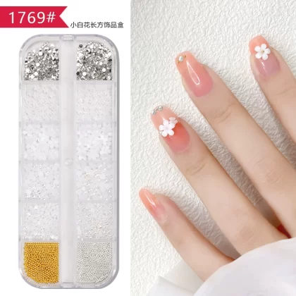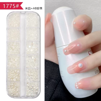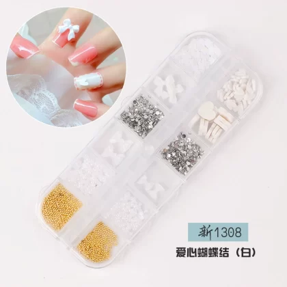 | nameOriginal | Manicure nail box decorations semi-circle pearl steel beads shell pieces gold foil small white flowers sequins love bow |