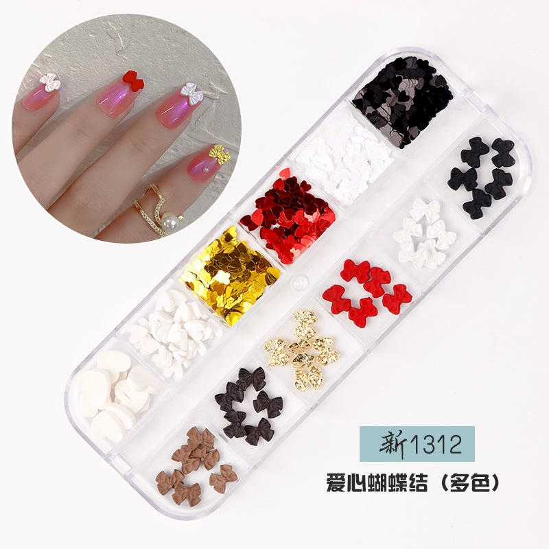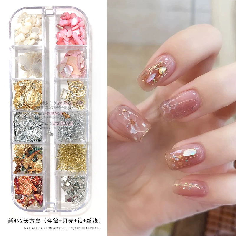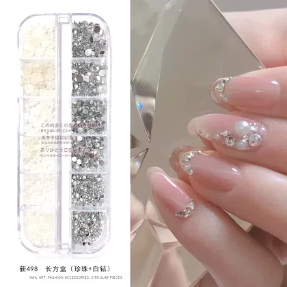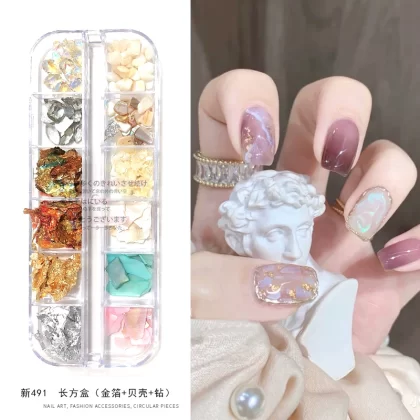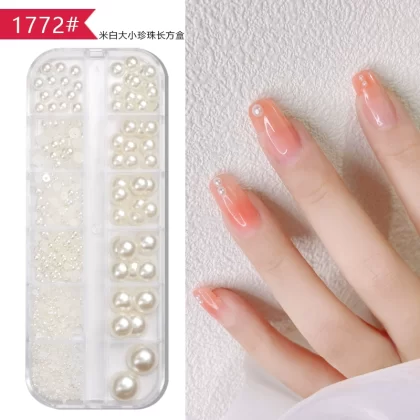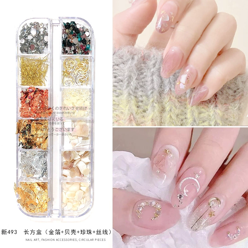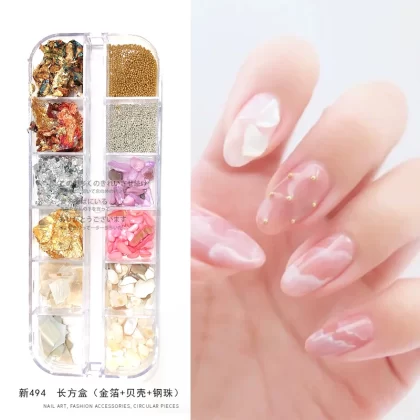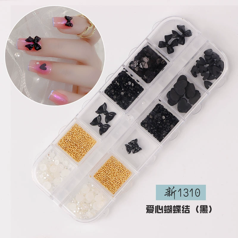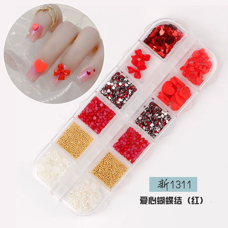 | nameOriginal | Manicure nail box decorations semi-circle pearl steel beads shell pieces gold foil small white flowers sequins love bow |