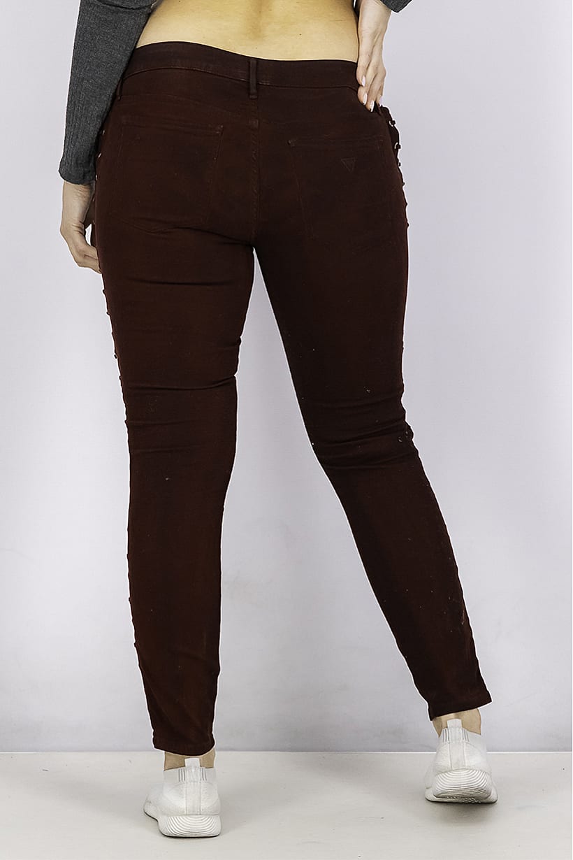 | descriptionOriginal | Bottom Hem : Straight, Care : Machine washable, Fit : Skinny Fit, Ideal For : Women, Size shown : US, Bottom Closure : Button, Zipper fly, Bottom Style/Pattern : Belt loops, Disclaimer : Product color may slightly vary due to photographic lighting sources or your monitor settings., Fabrics : 98% Cotton, 2% Elastane, Occasion : Casual, Pattern & Print : Textured pattern, Color Family : Maroon, Types of Jeans Rise : Mid rise, |