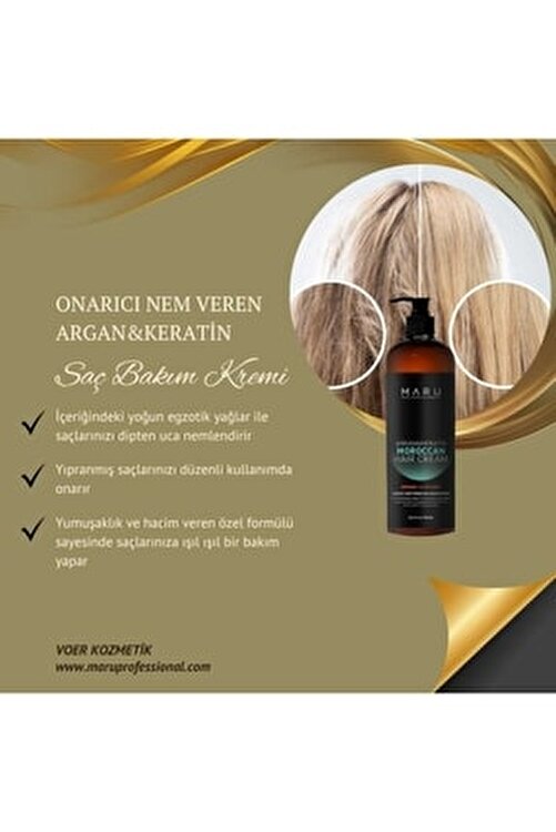 MARU HAIRCARE AUTHORITY ARGAN AND KERATIN MOROCCAN RESTORATIVE MOISTURIZING HAIR CARE CREAM 750 ml. Moisturizes your hair from bottom to end with dense exotic oils contained in it. Thanks to its special formula that gives softness and volume, it gives your hair a radiant care. It repairs your worn hair with regular use. Usage: Apply by massage with Moroccan cream. Leave for 5-10 minutes using a hair cap. Rinse with warm water. Then give the shape you want by pulling the blower and complete the maintenance process. Suitable for everyday use. Warnings: Protect from heat and light. Do not make eye contact. In case of contact with the eye, rinse immediately with plenty of water. Keep away from children. It is used externally. Ingredients: Aqua, Cetearyl Alcohol, Glycerin, Polyquaternium -7, Cetrimonium Chloride, Ethylhexylglycerin Phenoxyethanol, Dimethicone, Amodimethicone, C11-15 Pareth -7, Laureth -9, Trideceth-12, Parfum, Cyclopentasiloxane Guar Hydroxypropyltrimonium Chloride, Edta, Citric Acid, Argania Spinosa Kernel Oil, Hydrolized Keratin, Collegan, Biotin, Butyrospermum Parkii (Shea) Butter, Heypericum Perforatum Oil, Cocos Nucifera Oil, Ginkgo Biloba Leaf Extract, Camellia Sinensis Extract, Caffeine, Ganoderma Lucidum Extract.