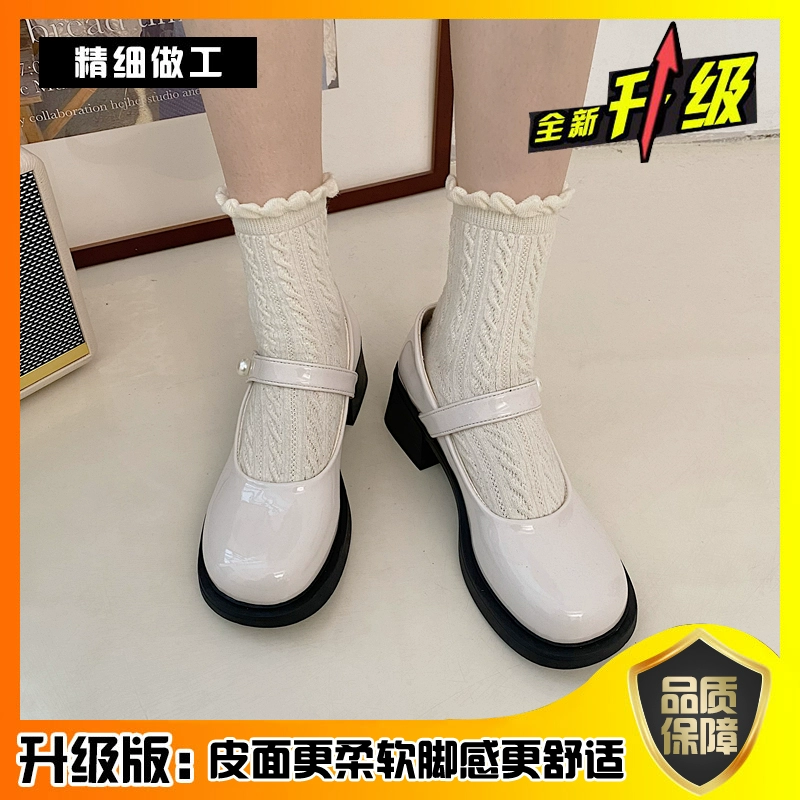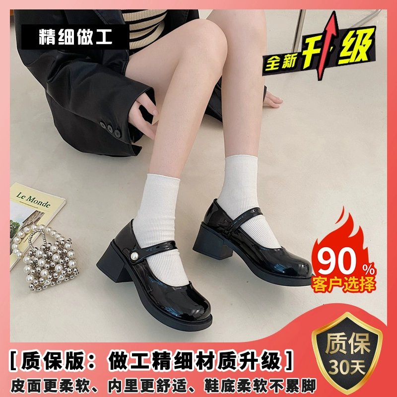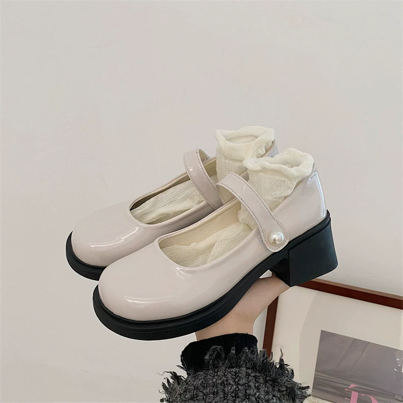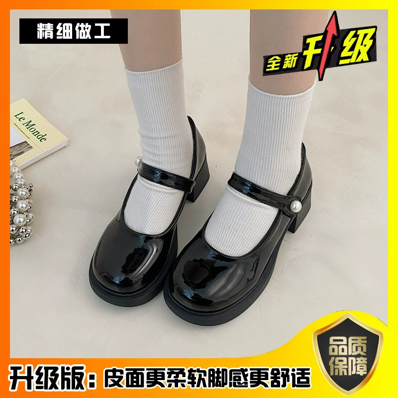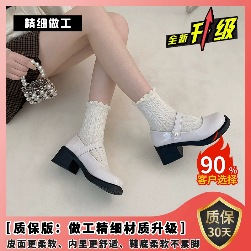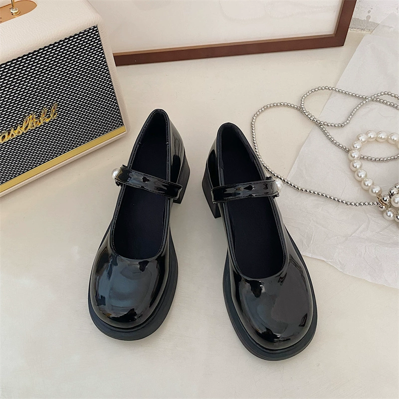 Mary Jane French style small leather shoes with round toe and thick heel