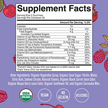 These organic mixed berry & cherry multivitamin gummies are formulated to give your child the vitamin boost they need. With Vitamin A, C, D3, a blend B Vitamins, Iodine, Zinc, and more, you can feel confident that your child is getting nutrients and ingredients their body will benefit from.
