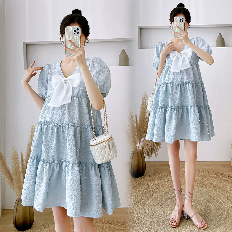 | nameOriginal | Maternity wear, summer dress, fashionable, contrasting color bow, short-sleeved pleated dress, loose A-line skirt, summer skirt |