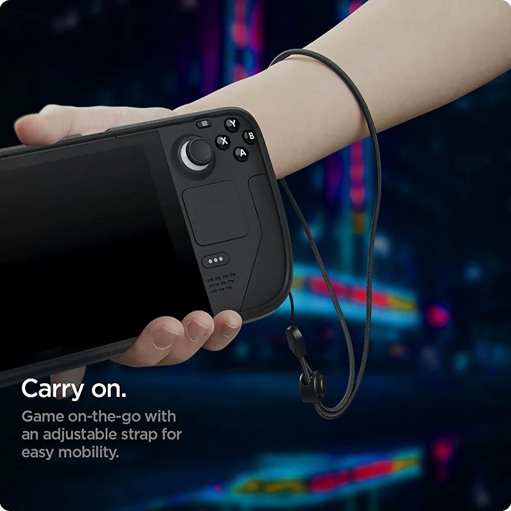 Matte Black Spigen Rugged Armor Steam Deck Case with Wrist Strap and TPU Cover Protector for Shock-Absorption and Anti-Scratch. Ideal Steam Deck Accessory.