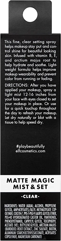 Ready, set, flawless makeup and skin. This fine, clear makeup setting mist helps lock your look into place for a beautiful matte finish that lasts. After applying makeup, mist the lightweight formula over your face to keep your makeup from running or fading, control shine, and refresh your look throughout the day. Plus, it's infused with skin-loving vitamins B & E plus Arctium Majus Root to deliver hydrating and soothing benefits for healthy-looking skin.