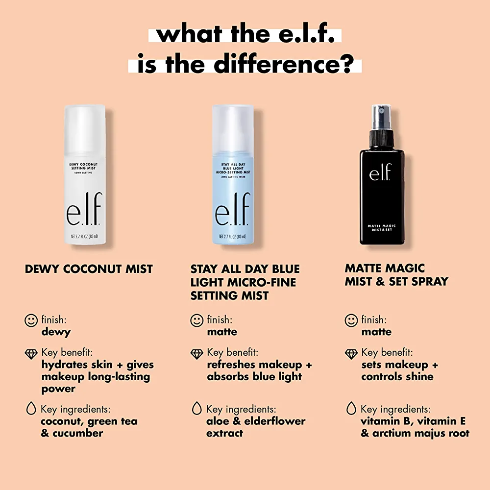 Matte Magic Mist & Set by e.l.f. – Long-lasting, lightweight mist that mattifies, revitalizes, and hydrates skin while controlling shine for all-day wear. Comes in a 2.02 fl oz bottle.