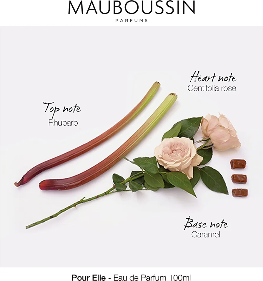 | descriptionOriginal | Pour Elle A true love potion ! Mauboussin Pour Elle is an eau de parfum with a powerful personality. Its floral and fruity olfactory notes, delicately mixing rhubarb, centifolia rose and caramel, are the promise of absolute love. An enchanting perfume Thanks to its captivating essences, the Mauboussin Pour Elle Eau De Parfum acts as a philter of love. Fascinating and ultra-feminine, it arouses desire and puts your senses in emotion. A jewel bottle A 4-branch star flask, emblematic symbol of the brand. Pass your finger through the ring of this perfume and unite for eternity. A charming scent With rhubarb extracts, Centifolia rose and caramel, supplemented by a scent of amber and sandal, this fragrance reveals a powerful and evolving wake. Floral and Fruity Olfactory Notes Head note: Rhubarb Pour Elle Elixir Pour Elle Rose Pour Elle Elixir Pour Elle Hair Mist |