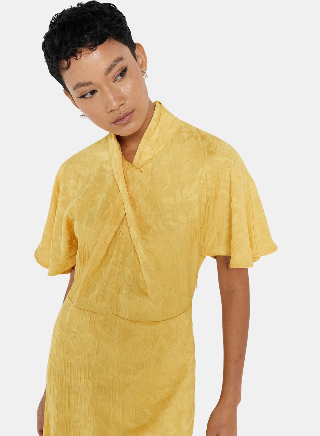 This product is a part of Mango’s Committed collection and is made from textured recycled polyester fabric. It features a high neck, short sleeves, and a concealed zipper closure on the side. The product has an A-line fit and is maxi length. Please refer to the care label instructions for washing. The model in the picture is approximately 172 cm tall and is wearing a size S.