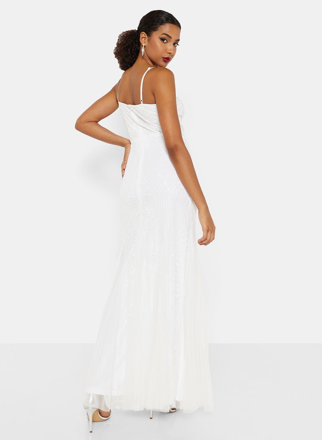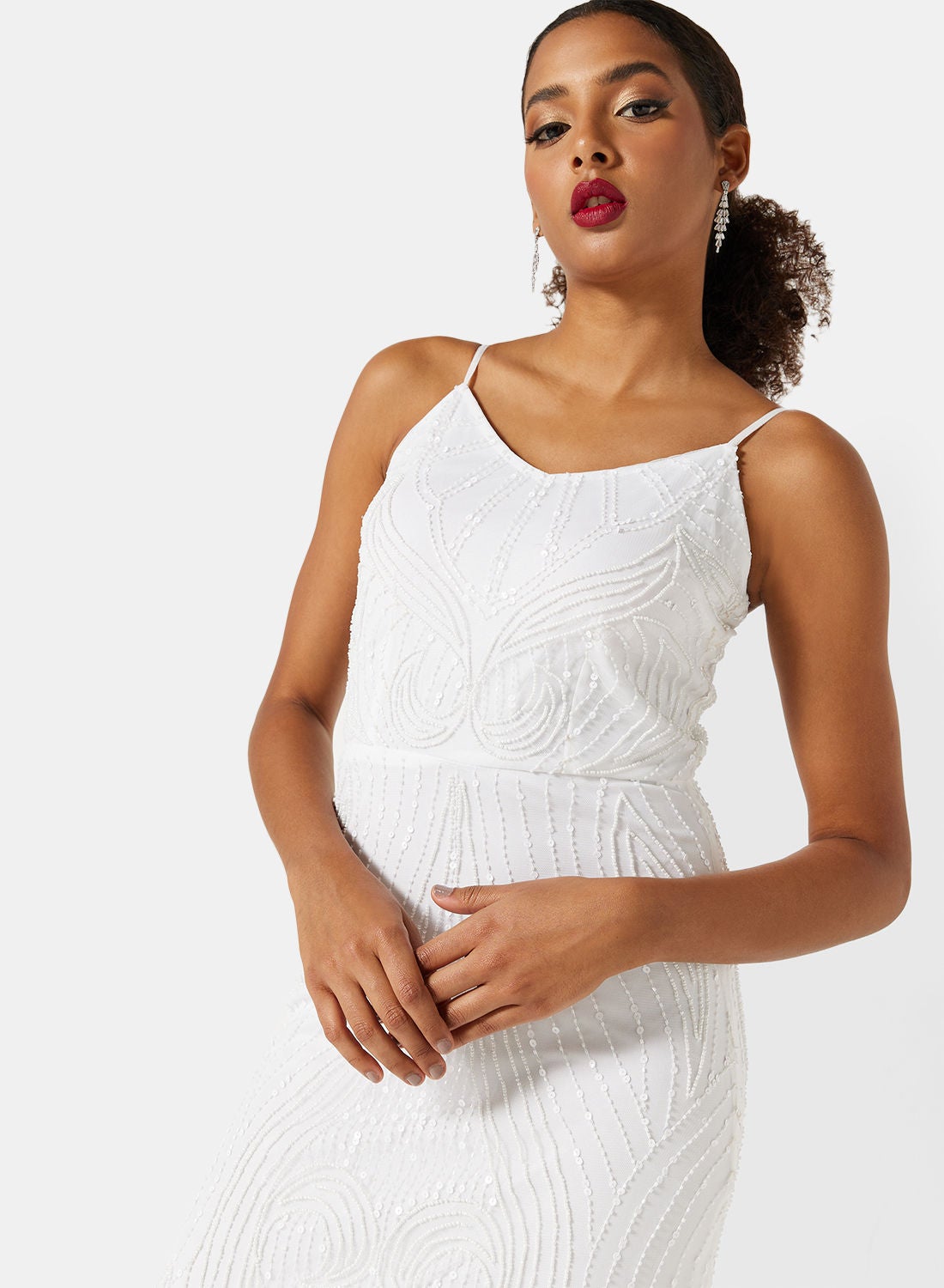 This product features a polyester fabric that is both soft and comfortable to wear. It is adorned with sequin embellished embroidered detail, and has a V-neck and slim shoulder straps. The back of the dress has a concealed zipper closure. The bodice is fitted, and the dress has a maxi length. To ensure the longevity of the product, please follow the care label instructions when washing. The model in the photo is approximately 178cm tall and is wearing a size 8.