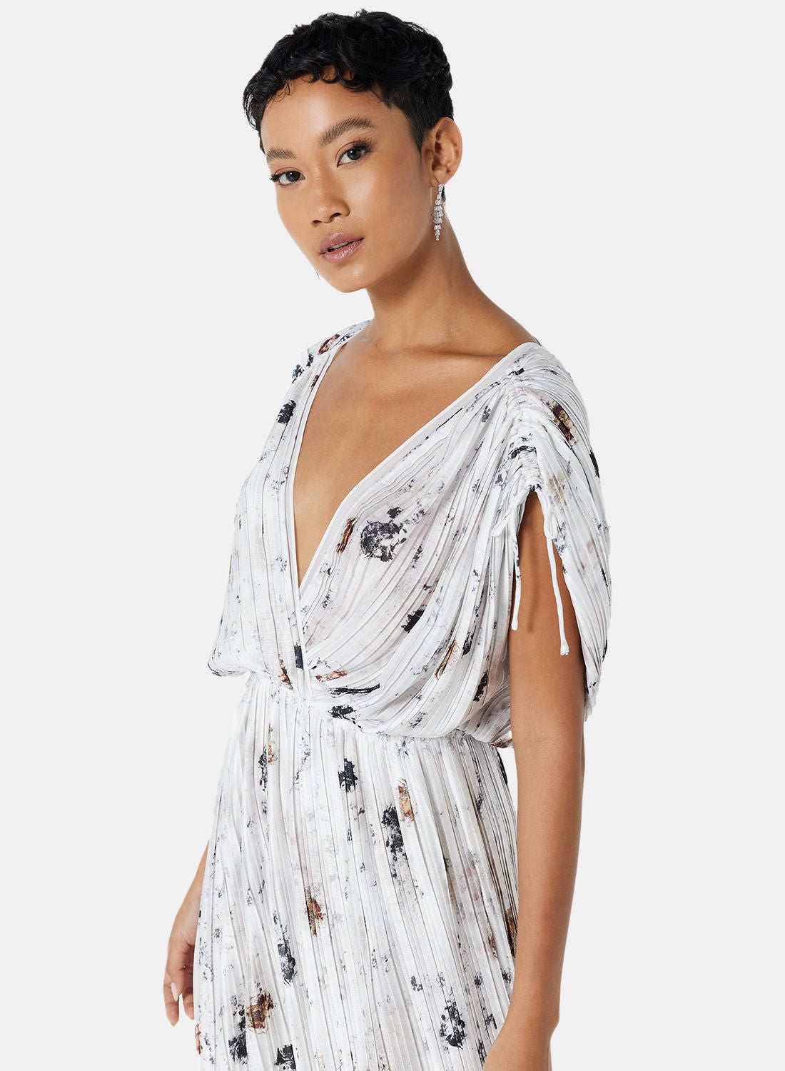 This product features a comfortable polyester fabric with pleats, an all-over abstract print, a V-neck, and extended sleeves. It also has an elasticated empire waistline and a regular fit with a maxi length. Please refer to the care label instructions for washing. The model is approximately 172 cm tall and is wearing a size S.
