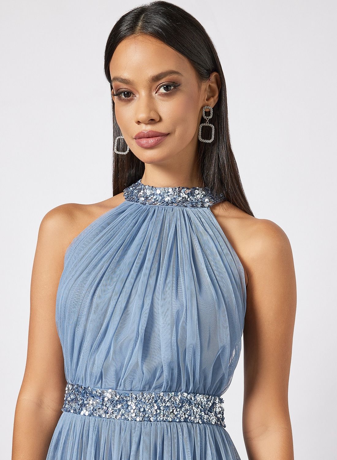 This product features a polyester fabric that is both textured and lightweight. It has a halter neck and sleeveless design, with sequin embellishments for added detail. The back has a concealed zipper closure. The bodice is fitted and the length is maxi. Please follow the care label instructions when washing. The model is approximately 178cm tall and is wearing a size 8.
