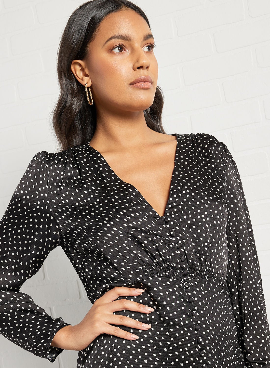 This product features a soft and breathable viscose material that provides a comfortable wearing experience. It showcases a stylish dotted print design all over the fabric, with a flattering V-neckline and long sleeves. The regular fit ensures a comfortable and relaxed fit for everyday wear. To maintain its quality, please follow the care label instructions when washing. The model in the picture is approximately 172 cm tall and is wearing a size S.