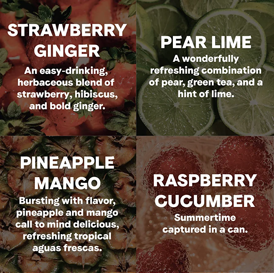4 DELICIOUS, SUBTLE FLAVORS: The Variety Pack includes 3 cans each of our four naturally flavored and refreshing prebiotic sodas: Strawberry Ginger with Hibiscus, Pear Lime with Green Tea, Pineapple Mango with Turmeric, and Raspberry Cucumber with Black Currant. No vinegar or fake sugar aftertaste.